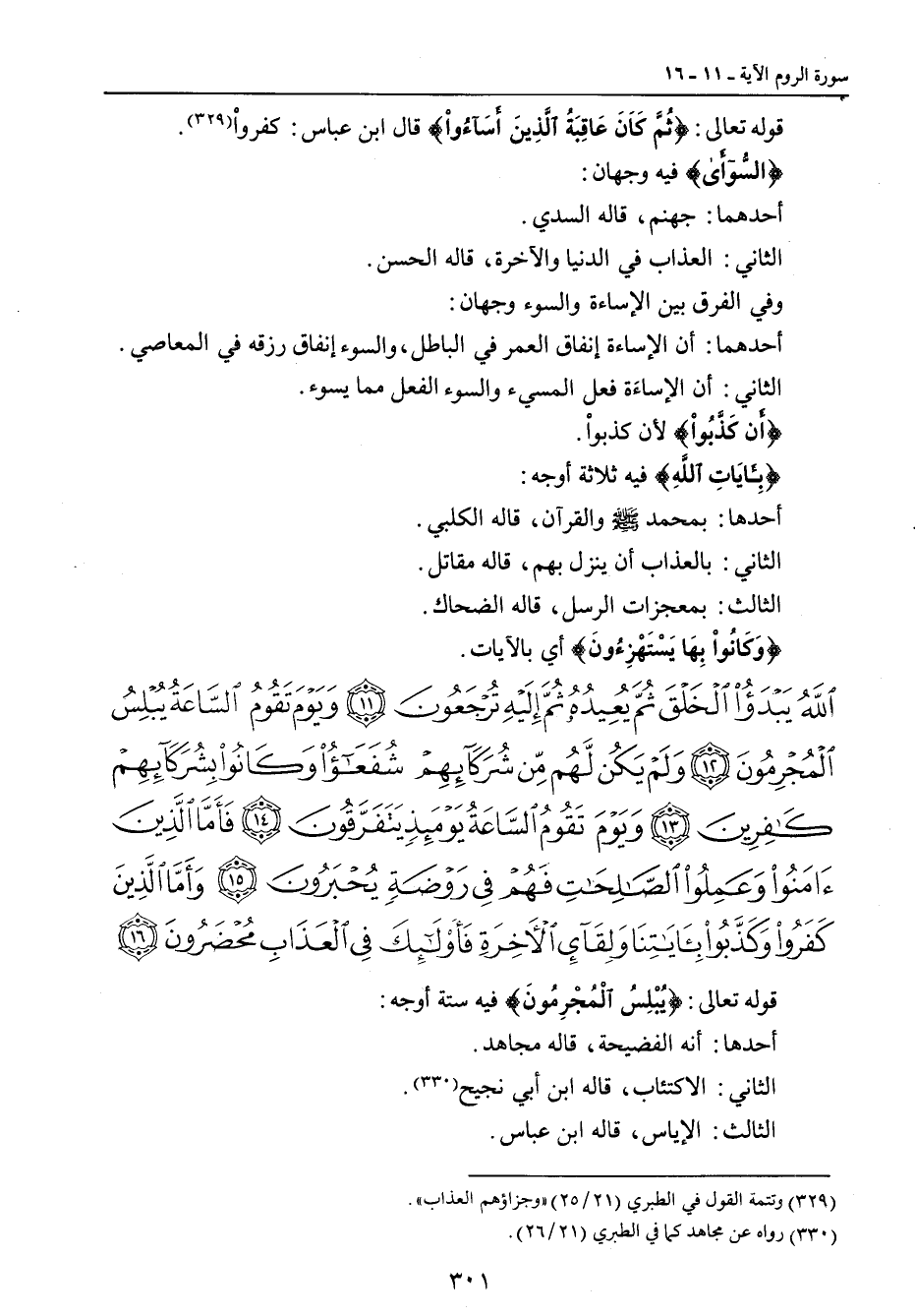 قوله تعالى: {ثُمَّ كَانَ عَاقِبَةُ الَّذِينَ أَسَآءُواْ} قال ابن عباس: كفرواْ. {السُّوأَى} فيه وجهان: أحدهما: جهنم , قاله السدي. الثاني: العذاب في الدنيا والآخرة , قاله الحسن. وفي الفرق بين الإساءة والسوء وجهان: أحدهما: أن الإساءة إنفاق العمر في الباطل , والسوء إنفاق رزقه في المعاصي. الثاني: أن الإِساءَة فعل المسيء والسوء الفعل مما يسوء. {أَن كَذَّبُواْ} لأن كذبواْ. {بِئَايَاتِ اللَّهِ} فيه ثلاثة أوجه: أحدها: بمحمد صلى الله عليه وسلم والقرآن , قاله الكلبي. الثاني: بالعذاب أن ينزل بهم , قاله مقاتل. الثالث: بمعجزات الرسل , قاله الضحاك. {وَكَانُواْ بِهَا يَسْتَهْزِءُونَ} أي بالآيات.
