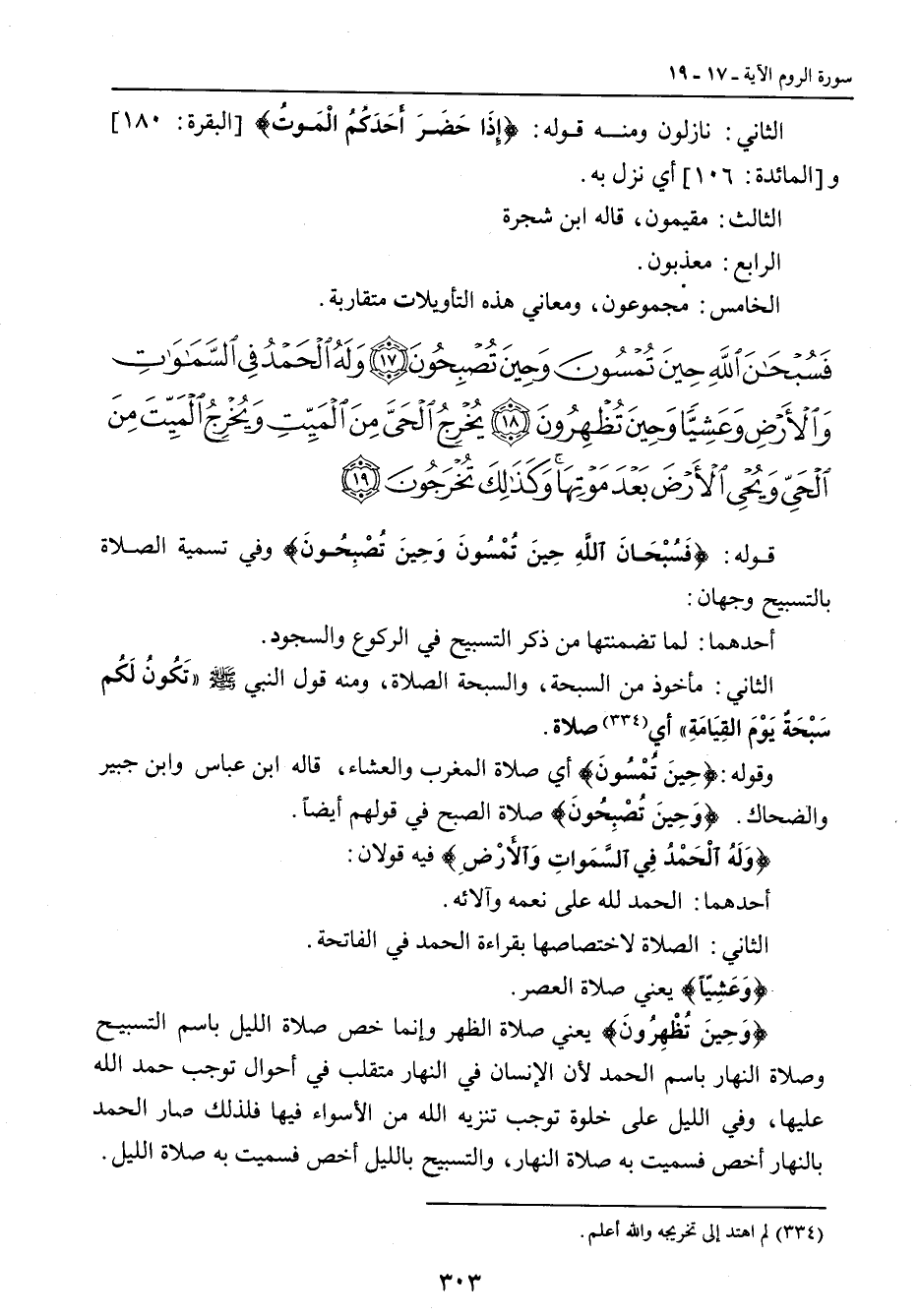 {فسبحان الله حين تمسون وحين تصبحون وله الحمد في السماوات والأرض وعشيا وحين تظهرون يخرج الحي من الميت ويخرج الميت من الحي ويحيي الأرض بعد موتها وكذلك تخرجون} قوله: {فَسُبْحَانَ اللَّهِ حِينَ تُمْسُونَ وَحِينَ تُصْبِحُونَ} وفي تسمية الصلاة بالتسبيح وجهان: أحدهما: لما تضمنتها من ذكر التسبيح في الركوع والسجود. الثاني: مأخوذ من السبحة , والسبحة الصلاة , ومنه قول النبي صلى الله عليه وسلم (تَكُونُ لَكُم سَبْحَةٌ يَوْمَ القِيَامَةِ) أي صلاة. وقوله: {حِينَ تُمْسُونَ} أي صلاة المغرب والعشاء , قاله ابن عباس وابن جبير والضحاك. {وَحِينَ تُصْبِحُونَ} صلاة الصبح في قولهم أيضاً. {وَلَهُ الْحَمْدُ فِي السَّمَواتِ وَالأَرْضِ} فيه قولان: أحدهما: الحمد لله على نعمه وآلائه. الثاني: الصلاة لاختصاصها بقراءة الحمد في الفاتحة. {وَعَشِّياً} يعني صلاة العصر. {وَحِينَ تَظْهِرُونَ} يعني صلاة الظهر وإنما خص صلاة الليل باسم التسبيح وصلاة النهار باسم الحمد لأن الإنسان في النهار متقلب في أحوال توجب حمد الله عليها , وفي الليل على خلوة توجب تنزيه الله من الأسواء فيها فلذلك صار الحمد بالنهار أخص فسميت به صلاة النهار، والتسبيح بالليل أخص فسميت به صلاة الليل.