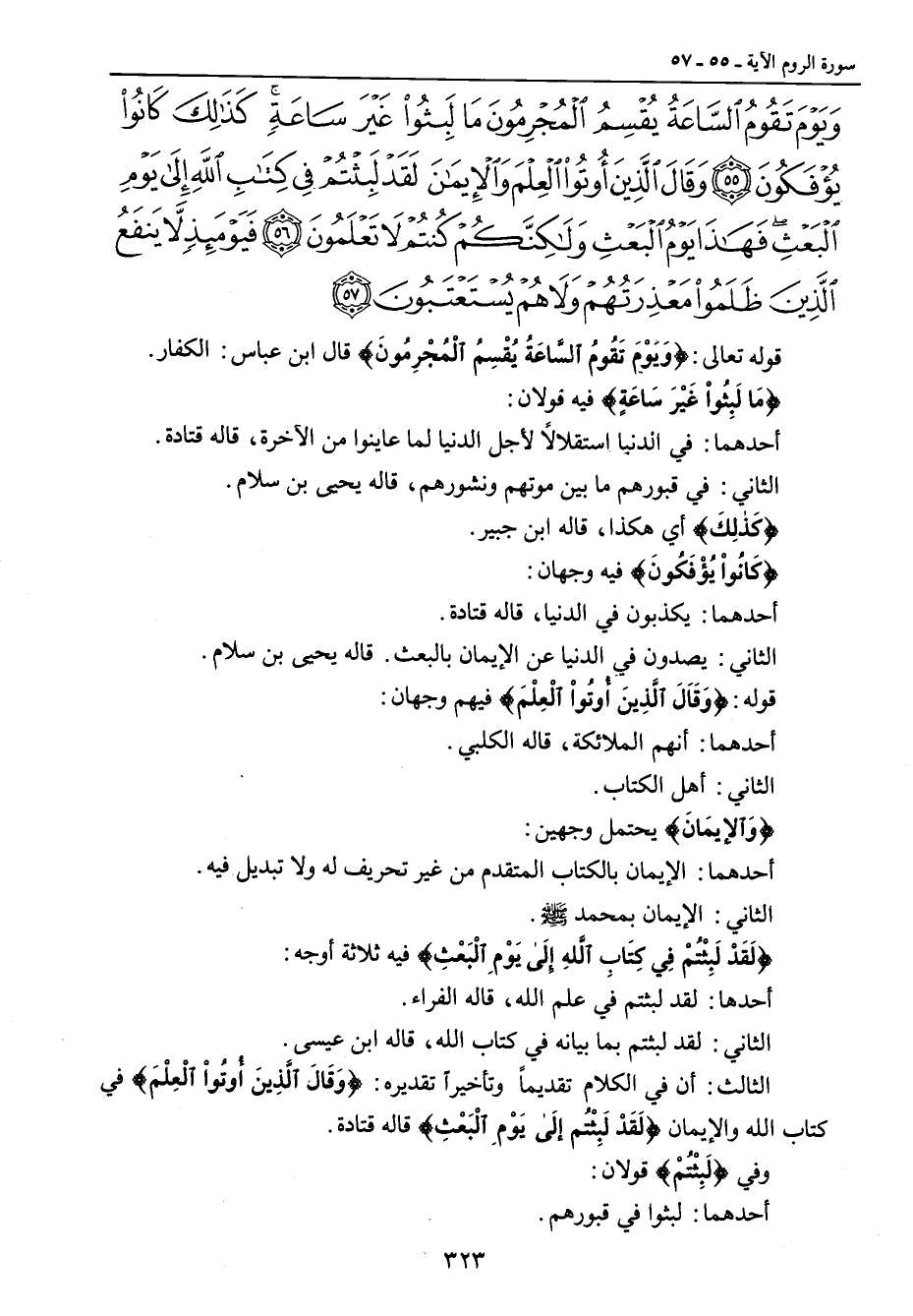 {ويوم تقوم الساعة يقسم المجرمون ما لبثوا غير ساعة كذلك كانوا يؤفكون وقال الذين أوتوا العلم والإيمان لقد لبثتم في كتاب الله إلى يوم البعث فهذا يوم البعث ولكنكم كنتم لا تعلمون فيومئذ لا ينفع الذين ظلموا معذرتهم ولا هم يستعتبون} قوله تعالى: {وَيَوْمَ تَقُومُ السَّاعَةُ يُقْسِمُ الْمُجْرِمُونَ} قال ابن عباس: الكفار. {مَا لَبِثواْ غَيْرَ سَاعَةٍ} فيه قولان: أحدهما: في الدنيا استقلالاً لأجل الدنيا لما عاينوا من الآخرة , قاله قتادة. الثاني: في قبورهم ما بين موتهم ونشورهم , قاله يحيى بن سلام. {كَذلِكَ} أي هكذا , قاله ابن جبير. {كَانُواْ يُؤْفَكُونَ} فيه وجهان: أحدهما: يكذبون في الدنيا , قاله قتادة. الثاني: يصدون في الدنيا عن الإيمان بالبعث. قاله يحيى بن سلام. قوله: {وَقَالَ الَّذِينَ أُوتُواْ الْعِلْمَ} فيهم وجهان: أحدهما: أنهم الملائكة , قاله الكلبي. الثاني: أهل الكتاب. {وَالإِيمَانَ} يحتمل وجهين: أحدهما: الإيمان بالكتاب المتقدم من غير تحريف له ولا تبديل فيه. الثاني: الإيمان بمحمد صلى الله عليه وسلم. {لَقَدْ لَبِثْتُمْ فِي كِتَابِ اللَّهِ إِلَى يَوْمِ الْبَعْثِ} فيه ثلاثة أوجه: أحدها: لقد لبثتم في علم الله , قاله الفراء. الثاني: لقد لبثتم بما بيانه في كتاب الله , قاله ابن عيسى. الثالث: أن في الكلام تقديماً وتأخيراً تقديره: {وَقَالَ الَّذِينَ أُوتُواْ الْعِلْمَ} في كتاب الله والإيمان {لَقَدْ لَبِثْتُم إِلَى يَوْمِ الْبَعْثِ} قاله قتادة. وفي {لَبِثْتُمْ} قولان: أحدهما: لبثوا في قبورهم.