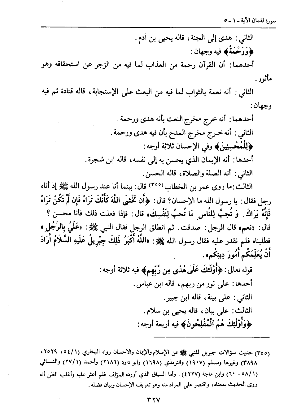 الثاني: هدى إلى الجنة , قاله يحيى بن آدم. {وَرَحْمَةً} فيه وجهان: أحدهما: أن القرآن رحمة من العذاب لما في من الزجر عن استحقاقه وهو وجهان: أحدهما: أنه خرج مخرج النعت بأنه هدى ورحمة. الثاني: أنه خرج مخرج المدح بأن فيه هدى ورحمة. {لِلْمُحْسِنِينَ} وفي الإحسان ثلاثة أوجه: أحدها: أنه الإيمان الذي يحسن به إلى نفسه , قاله ابن شجرة. الثاني: أنه الصلة والصلاة , قاله الحسن. الثالث: ما روى عمر بن الخطاب قال: بينما أنا عند رسول الله صلى الله عليه وسلم إذ أتاه رجل فقال: يا رسول الله ما الإحسان؟ قال: (أًن تَخْشَى اللَّهَ كَأَنَّكَ تَرَاهُ فَإِن لَّمْ تَكُنْ تَرَاهُ فَإِنَّهُ يَرَاكَ. وَتُحِبَّ لِلنَّاسِ مَا تُحبُ لِنَفْسِكَ) قال: فإذا فعلت ذلك فأنا محسن؟ قال: (نعم) قال الرجل: صدقت. ثم انطلق الرجل فقال النبي صلى الله عليه وسلم: (عَلَيَّ بِالرَّجُلِ). فطلبناه فلم نقدر عليه فقال رسول الله صلى الله عليه وسلم: (اللَّهُ أَكْبَرُ ذَلِكَ جِبْرِيلُ عَلَيِهِ السَّلاَمُ أَرَادَ أَنْ يُعَلِّمَكُم أَمُورَ دِينِكُم). قوله تعالى: {أُوْلَئِكَ عَلَى هُدًى مِن رَّبِّهِم} فيه ثلاثة أوجه: أحدها: على نور من ربهم , قاله ابن عباس. الثاني: على بينة , قاله ابن جبير. الثالث: على بيان , قاله يحيى بن سلام. {وَأُوْلَئِكَ هُمُ الْمُفْلِحُونَ} فيه أربعة أوجه: