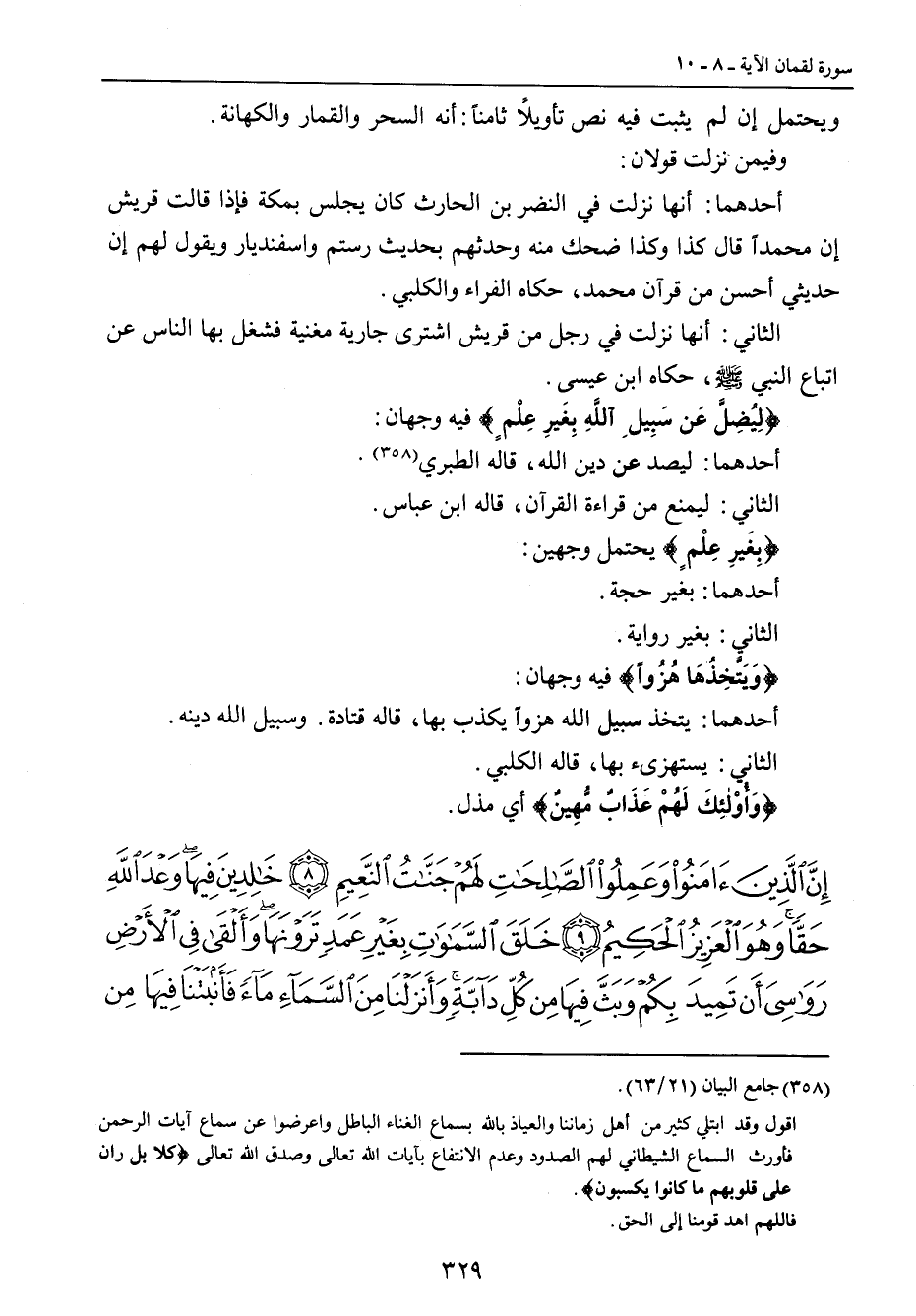 ويحتمل إن لم يثبت فيه نص تأويلاً ثامناً: أنه السحر والقمار والكهانة. وفيمن نزلت قولان: أحدهما: أنها نزلت في النضر بن الحارث كان يجلس بمكة فإذا قالت قريش إن محمداً قال كذا وكذا ضحك منه وحدثهم بحديث رستم واسفنديار ويقول لهم إن حديثي أحسن من قرآن محمد , حكاه الفراء والكلبي. الثاني: أنها نزلت في رجل من قريش اشترى جارية مغنية فشغل بها الناس عن اتباع النبي صلى الله عليه وسلم , حكاه ابن عيسى. {لِيُضِلَّ عَن سَبيلِ اللَّهِ بِغَيرِ عِلْمٍ} فيه وجهان: أحدهما: ليصد عن دين الله , قاله الطبري. الثاني: ليمنع من قراءة القرآن , قاله ابن عباس. {بِغَيرِ عِلْمٍ} يحتمل وجهين: أحدهما: بغير حجة. الثاني: بغير رواية. {وَيَتَّخِذُهَا هُزُواً} فيه وجهان: أحدهما: يتخذ سبيل الله هزواً يكذب بها , قاله قتادة. وسبيل الله دينه. الثاني: يستهزىء بها , قاله الكلبي. {وَأُوْلئِكَ لَهُمْ عَذَابٌ مُّهِينٌ} أي مذل.