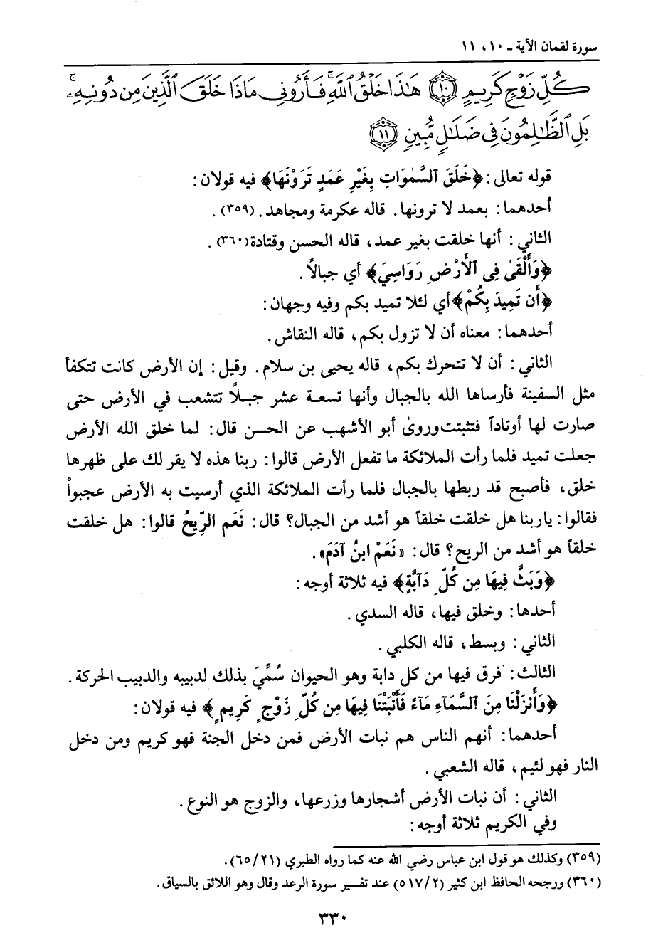 كل زوج كريم هذا خلق الله فأروني ماذا خلق الذين من دونه بل الظالمون في ضلال مبين} قوله تعالى: {خَلَقَ السَّموَاتِ بِغَيْرِ عَمَدٍ تَرَوْنَهَا} فيه قولان: أحدهما: بعمد لا ترونها , قاله عكرمة ومجاهد. الثاني: أنها خلقت بغير عمد , قاله الحسن وقتادة. {وَأَلْقَى فِي الأَرْضِ رَوَاسِيَ} أي جبالاً. {أَن تَمِيدَ بِكُمْ} أي لئلا تميد بكم وفيه وجهان: أحدهما: معناه أن لا تزول بكم , قاله النقاش. الثاني: أن لا تتحرك بكم , قاله يحيى بن سلام. وقيل: إن الأرض كانت تتكفأ مثل السفينة فأرساها الله بالجبال وأنها تسعة عشر جبلاً تتشعب في الأرض حتى صارت لها أوتاداً فتثبتت وروى أبو الأشهب عن الحسن قال: لما خلق الله الأرض جعلت تميد فلما رأت الملائكة ما تفعل الأرض قالوا: ربنا هذه لا يقر لك على ظهرها خلق , فأصبح قد ربطها بالجبال فلما رأت الملائكة الذي أرسيت به الأرض عجبواْ فقالوا: يا ربنا هل خلقت خلقاً هو أشد من الجبال؟ قال: نَعَم الرِّيحُ قالوا: هل خلقت خلقاً هو أشد من الريح؟ قال: (نَعَمْ ابنُ آدَمَ). {وَبَثَّ فِيهَا مِن كُلِّ دَآبَّةٍ} فيه ثلاثة أوجه: أحدها: وخلق فيها , قاله السدي. الثاني: وبسط , قاله الكلبي. الثالث: فرق فيها من كل دابة وهو الحيوان سُمِّيَ بذلك لدبيبه والدبيب الحركة. {وَأَنزَلْنَا مِنَ السَّمَآءِ مَآءً فَأنْبَتْنَا فِيهَا مِن كُلِّ زَوْجٍ كَرِيمٍ} فيه قولان: أحدهما: أنهم الناس هم نبات الأرض فمن دخل الجنة فهو كريم ومن دخل النار فهو لئيم , قاله الشعبي. الثاني: أن نبات الأرض أشجارها وزرعها , والزوج هو النوع. وفي الكريم ثلاثة أوجه: