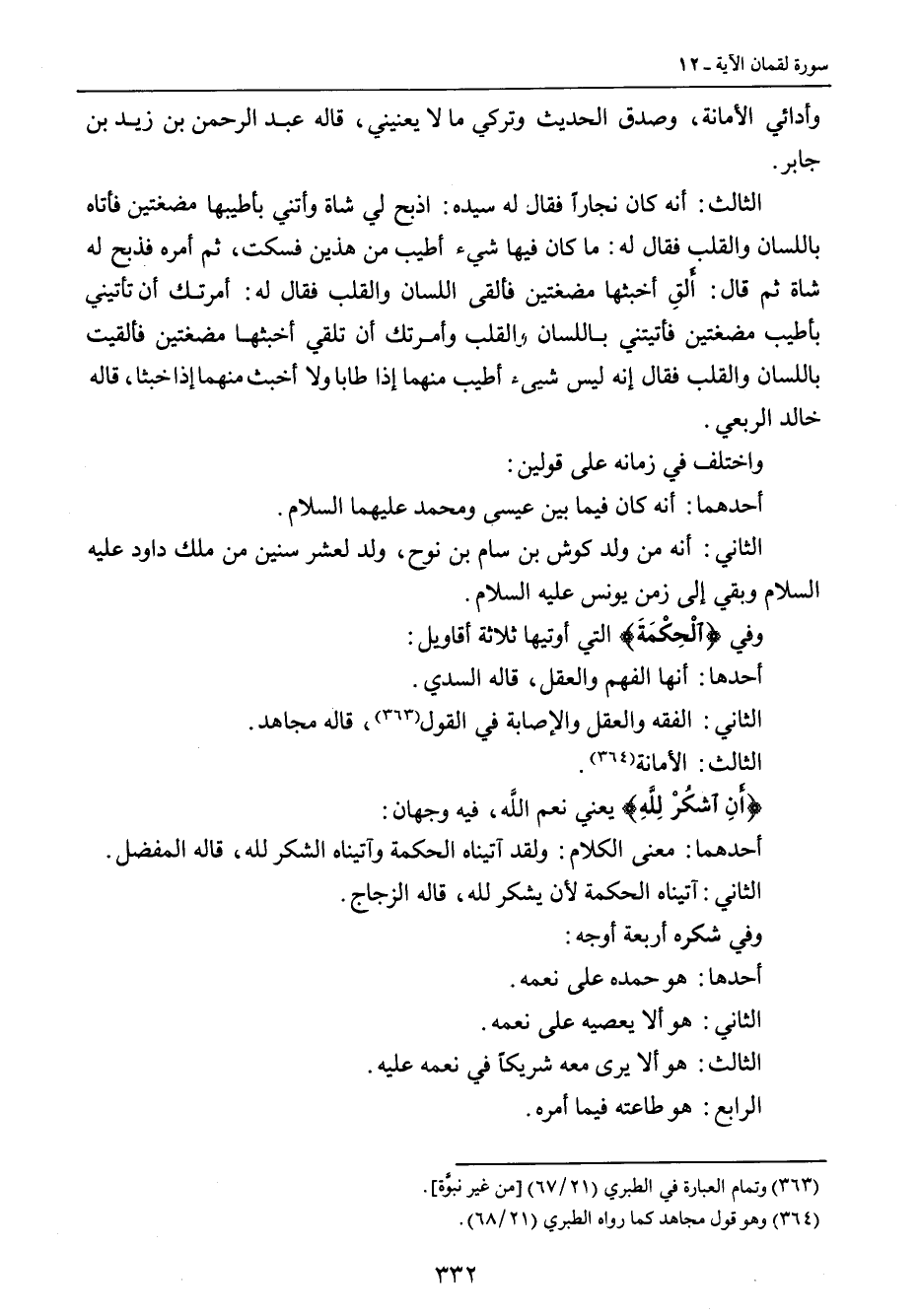 وأدائي الأمانة، وصدق الحديث وتركي ما لا يعنيني , قاله عبد الرحمن بن زيد بن جابر. الثالث: أنه كان نجاراً فقال له سيده: اذبح لي شاة وأتني بأطيبها مضغتين فأتاه باللسان والقلب فقال له: ما كان فيها شيء أطيب من هذين فسكت , ثم أمره فذبح له شاة ثم قال: أَلقِ أخبثها مضغتين فألقى اللسان والقلب فقال له: أمرتك أن تأتيني بأطيب مضغتين فأتيتني باللسان والقلب وأمرتك أن تلقي أخبثها مضغتين فألقيت باللسان والقلب فقال إنه ليس شيىء أطيب منهما إذا طابا ولا أخبث منهما إذا خبثا , قاله خالد الربعي. واختلف في زمانه على قولين: أحدهما: أنه كان فيما بين عيسى ومحمد عليهما السلام. الثاني: أنه ولد كوش بن سام بن نوح , ولد لعشر سنين من ملك داود عليه السلام وبقي إلى زمن يونس عليه السلام. وفي {الْحِكْمَةَ} التي أوتيها ثلاثة أقاويل: أحدها: أنها الفهم والعقل , قاله السدي. الثاني: الفقه والعقل والإصابة في القول , قاله مجاهد. الثالث: الأمانة. {أَنِ اشكُرْ لِلَّهِ} يعني نعم اللَّه، فيه وجهان: أحدهما: معنى الكلام: ولقد آتيناه الحكمة وآتيناه الشكر لله، قاله المفضل. الثاني: آتيناه الحكمة لأن يشكر لله , قاله الزجاج. وفي شكره أربعة أوجه: أحدها: هو حمده على نعمه. الثاني: هو ألا يعصيه على نعمه. الثالث: هو ألا يرى معه شريكاً في نعمه عليه. الرابع: هو طاعته فيما أمره.