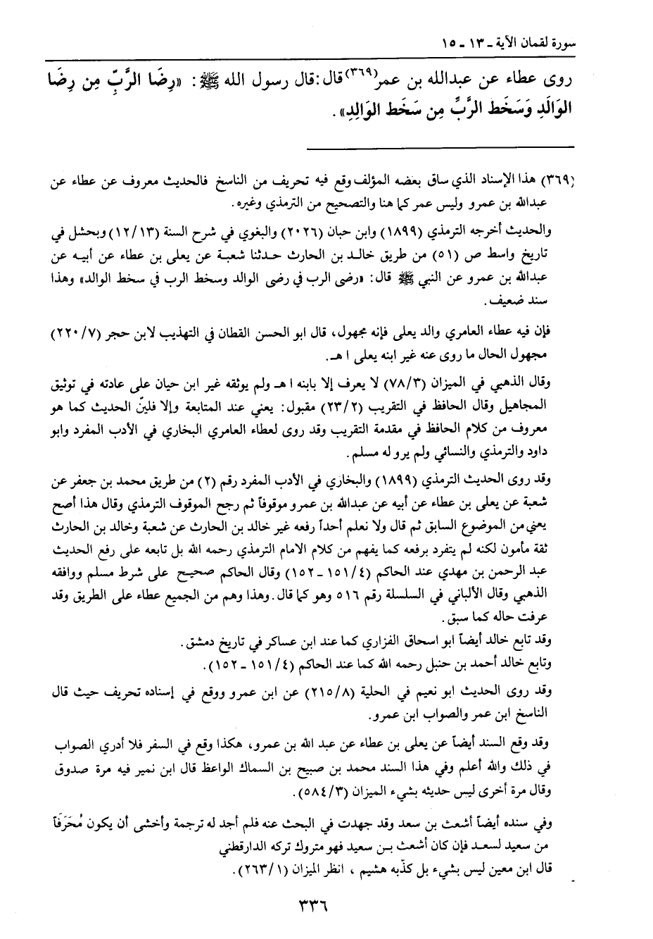 روى عطاء عن عبد الله بن عمر قال: قال رسول الله صلى الله عليه وسلم: (رِضَا الرَّبِّ مِن رِضَا الوَالَدِ وَسَخَط الرَّبِّ مَن سَخَط الوَالِدِ).