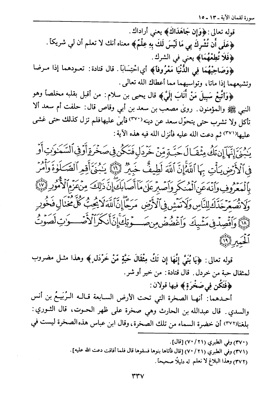 {يا بني إنها إن تك مثقال حبة من خردل فتكن في صخرة أو في السماوات أو في الأرض يأت بها الله إن الله لطيف خبير يا بني أقم الصلاة وأمر بالمعروف وانه عن المنكر واصبر على ما أصابك إن ذلك من عزم الأمور ولا تصعر خدك للناس ولا تمش في الأرض مرحا إن الله لا يحب كل مختال فخور واقصد في مشيك واغضض من صوتك إن أنكر الأصوات لصوت الحمير} قوله تعالى: {يَا بُنَيَّ إِنَّهَا إِن تَكُ مِثْقَالَ حَبَّةٍ مّنْ خَرْدَلٍ} وهذا مثل مضروب لمثقال حبة من خردل. قال قتادة: من خير أو شر. {فَتَكُن فِي صَخْرَةٍ} فيها قولان: أحدهما: أنها الصخرة التي تحت الأرض السابعة قاله الرُبَيعُ بن أنس والسدي. قال عبد الله بن الحارث وهي صخرة على ظهر الحوت , قال الثوري: بلغنا أن خضرة السماء من تلك الصخرة , وقال ابن عباس هذه الصخرة ليست في