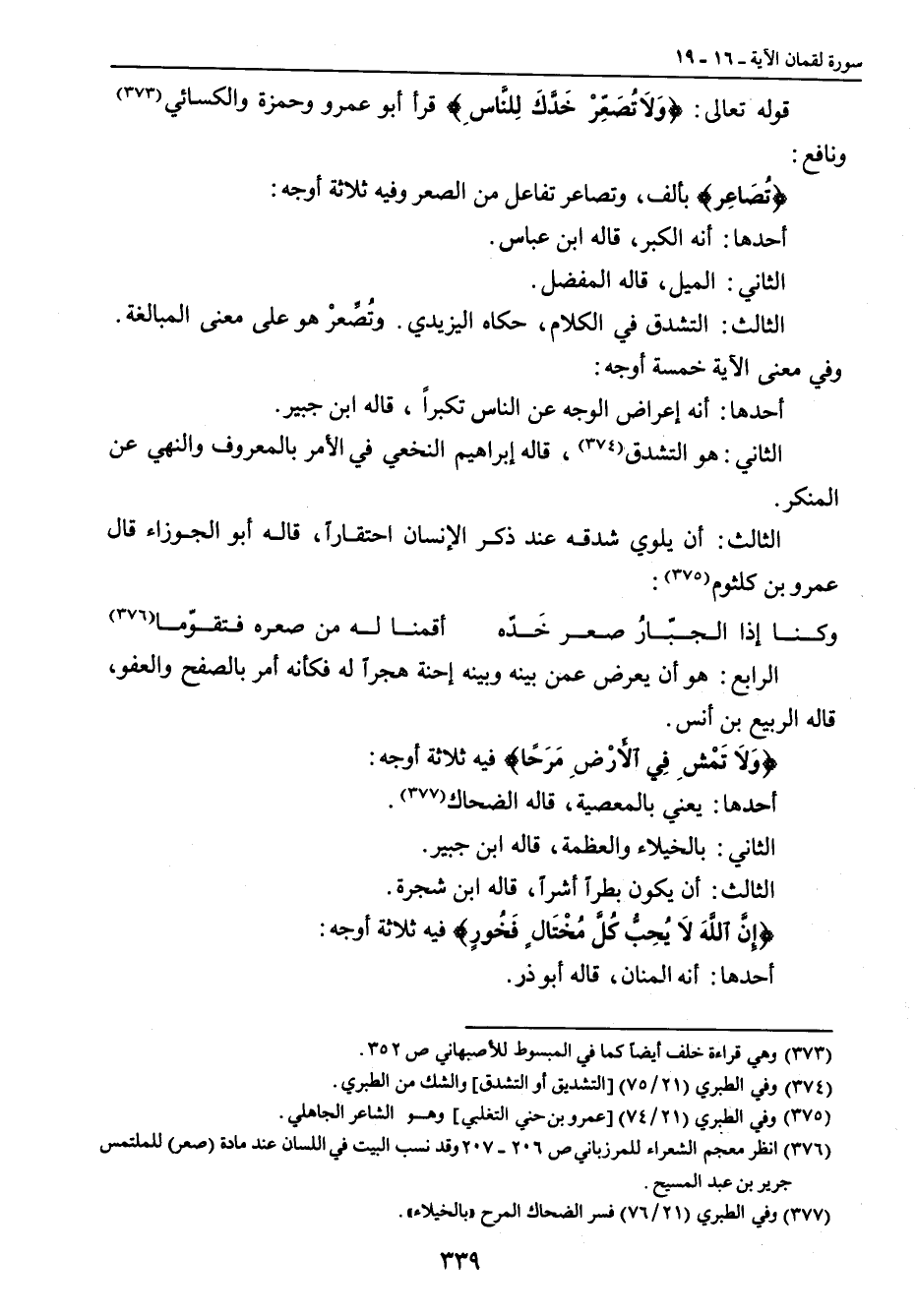 قوله تعالى: {وَلاَ تُصَعِّرْ خَدَّكَ لِلنَّاسِ} قرأ أبو عمرو وحمزة والكسائي ونافع. {تُصَاعِر} بألف , وتصاعر تفاعل من الصعر وفيه ثلاثة أوجه: أحدها: أنه الكبر , قاله ابن عباس. الثاني: الميل , قاله المفضل. الثالث: التشدق في الكلام , حكاه اليزيدي , وتُصِّعرْ هو على معنى المبالغة. وفي معنى الآية خمسة أوجه: أحدها: أنه إعراض الوجه عن الناس تكبراً , قاله ابن جبير. الثاني: هوالتشدق , قاله إبراهيم النخعي في الأمر بالمعروف والنهي عن المنكر. الثالث: أن يلوي شدقه عند ذكر الإنسان احتقاراً , قاله أبو الجوزاء , قال عمرو بن كلثوم.