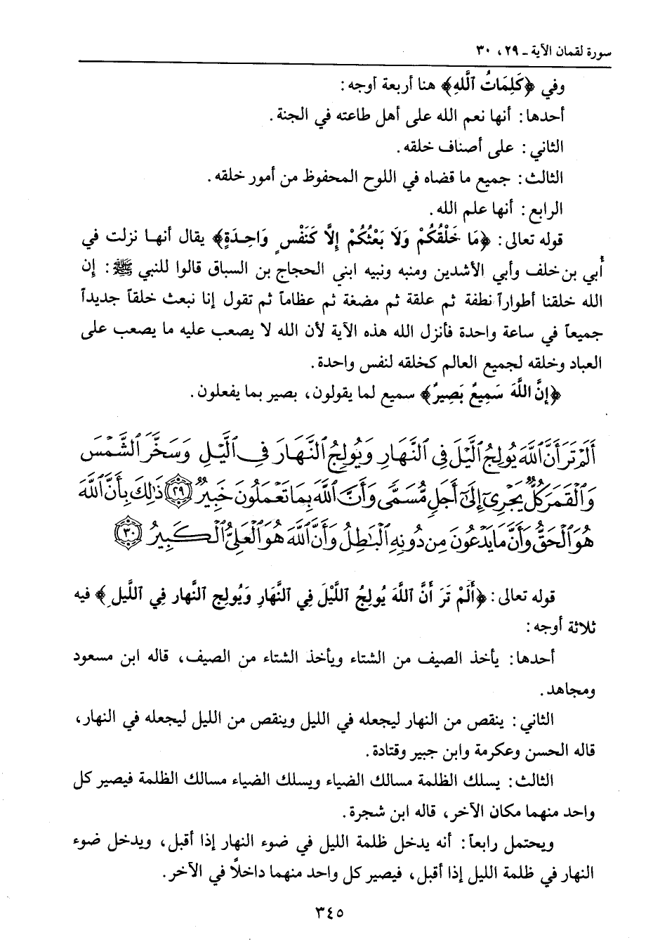 وفي {كَلِمَاتُ اللُّهِ} هنا أربعة أوجه: أحدها: أنها نعم الله على أهل طاعته في الجنة. الثاني: على أصناف خلقه. الثالث: جميع ما قضاه في اللوح المحفوظ من أمور خلقه. الرابع: أنها علم الله. قوله تعالى: {مَا خَلْقَكُمُ وَلاَ بَعْثُكُمْ إِلاَّ كَنَفْسٍ وَاحِدَةٍ} يقال إنها نزلت في أُبي بن خلف وأبي الأشدين ومنبه ونبيه ابني الحجاج بن السباق قالوا للنبي صلى الله عليه وسلم: إِن الله خلقنا أطواراً نطفة ثم علقة ثم مضغة ثم عظاماً ثم تقول إنا نبعث خلقاً جديداً جميعاً في ساعة واحدة فأنزل الله هذه الآية لأن الله لا يصعب عليه ما يصعب على العباد وخلقه لجميع العالم كخلقه لنفس واحدة. {إنَّ اللَّهَ سَمِيعٌ بَصِيرٌ} سميع لما يقولون , بصير بما يفعلون.