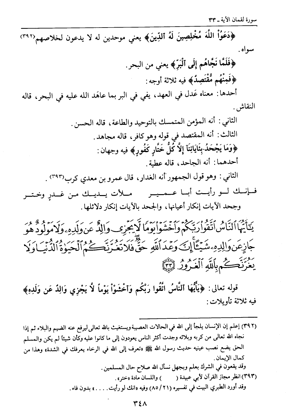 {يا أيها الناس اتقوا ربكم واخشوا يوما لا يجزي والد عن ولده ولا مولود هو جاز عن والده شيئا إن وعد الله حق فلا تغرنكم الحياة الدنيا ولا يغرنكم بالله الغرور إن الله عنده علم الساعة وينزل الغيث ويعلم ما في الأرحام وما تدري نفس ماذا تكسب غدا وما تدري نفس بأي أرض تموت إن الله عليم خبير} قوله تعالى: {يَأَيُّهَا النَّاسُ اتَّقُوا رَبَّكُم وَاخْشُوْاْ يَوْماً لاَّ يَجْزِي وَالِدٌ عَن وَلَدِهِ} فيه ثلاثة تأويلات:
