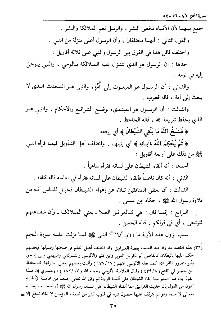 جمع بينهما لأن الأنبياء تخص البشر، والرسل تعم الملائكة والبشر. والقول الثاني: أنهما مختلفان , وأن الرسول أعلى منزلة من النبي. واختلف قائل هذا في الفرق بين الرسول والنبي على ثلاثة أقاويل: أحدها: أن الرسول هو الذي تتنزل عليه الملائكة بالوحي , والنبي يوحى إليه في نومه. والثاني: أن الرسول هو المبعوث إلى أُمَّةٍ , والنبي هو المحدث الذي لا يبعث إلى أمة , قاله قطرب. والثالث: أن الرسول هو المبتدىء بوضع الشرائع والأحكام , والنبي هو الذي يحفظ شريعة الله , قاله الجاحظ. {فَيَنسَخُ اللَّهُ مَا يُلْقِي الشَّيْطَانُ} أي يرفعه. {ثُمَّ يُحْكِمُ اللَّهُءَآيَاتِهِ} أي يثبتها , واختلف أهل التأويل فيما قرأه النبي صلى الله عليه وسلم من ذلك على أربعة أقاويل: أحدها: أنه ألقاه الشيطان على لسانه فقرأه ساهياً. الثاني: أنه كان ناعساً فألقاه الشيطان على لسانه فقرأه في نعاسه قاله قتادة. الثالث: أن بعض المنافقين تلاه عن إغواء الشيطان فخيل للناس أنه من تلاوة رسول الله صلى الله عليه وسلم , حكاه ابن عيسى. الرابع: إنما قال: هي كالغرانيق العلا - يعني الملائكة - وأن شفاعتهم لترتجى , أي في قولكم , قاله الحسن. سبب نزول هذه الآية ما روي أن النبي صلى الله عليه وسلم لما نزلت عليه سورة النجم