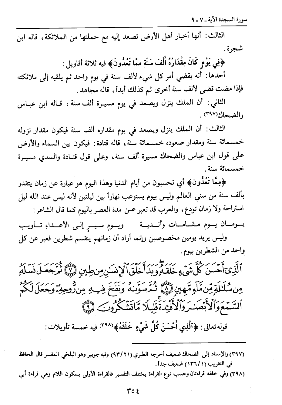 الثالث: أنها أخبار أهل الأرض تصعد إليه مع حملتها من الملائكة , قاله ابن شجرة. {فِي يَوْمٍ كَانَ مِقْدَارُهُ أَلْفَ سَنَةٍ ممَّا تَعُدُّونَ} فيه ثلاثة أقاويل: أحدها: أنه يقضي أمر كل شيء لألف سنة في يوم واحد ثم يلقيه إلى ملائكته فإذا مضت قضى لألف سنة أخرى ثم كذلك أبداً , قاله مجاهد. الثاني: أن الملك ينزل ويصعد في يوم مسيرة ألف سنة , قاله ابن عباس. والضحاك. الثالث: أن الملك ينزل ويصعد في يوم مقداره ألف سنة فيكون مقدار نزوله خمسمائة سنة ومقدار صعوده خمسمائة سنة , قاله قتادة: فيكون بين السماء والأرض على قول ابن عباس والضحاك مسيرة ألف سنة , وعلى قول قتادة والسدي مسيرة خمسمائة سنة. {مِمَّا تَعُدُّونَ} أي تحسبون من أيام الدنيا وهذا اليوم هو عبارة عن زمان يتقدر بألف سنة من سني العالم وليس بيوم يستوعب نهاراً بين ليلتين لأنه ليس عند الله ليل استراحة ولا زمان تودع , والعرب قد تعبر عن مدة العصر باليوم كما قال الشاعر: