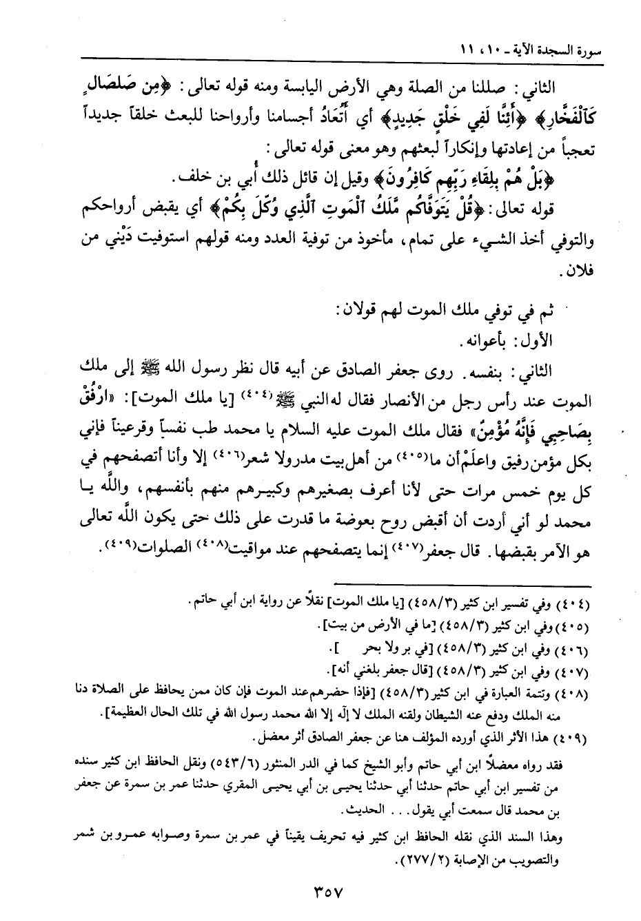 الثاني: صللنا من الصلة وهي الأرض اليابسة ومنه قوله تعالى: {مِن صَلصَالٍ كَالْفَخَّارِ} {أَئِنَّا لَفِي خَلْقٍ جَدِيدٍ} أي أَتُعَادُ أجسامنا للبعث خلقاً جديداً تعجباً من إعادتها وإنكاراً لبعثهم وهو معنى قوله تعالى: {بَلْ هُمْ بِلِقَاءِ رَبِّهِم كَافِرُونَ} وقيل إن قائل ذلك أُبي بن خلف. قوله تعالى: {قُلْ يَتَوَفَّاكُم مَّلَكُ الْمَوتِ الَّذِي وُكّلَ بِكُمْ} أي يقبض أرواحكم والتوفي أخذ الشيء على تمام , مأخوذ من توفية العدد ومنه قولهم استوفيت دَيْني من فلان. ثم في توفي ملك الموت لهم قولان: الأول: بأعوانه. الثاني: بنفسه. روى جعفر الصادق عن أبيه قال نظر رسول الله صلى الله عليه وسلم إلى ملك الموت عند رأس رجل من الأنصار فقال له النبي صلى الله عليه وسلم [يا ملك الموت]: (ارْفُقْ بِصَاحِبِي فَإِنَّهُ مُؤْمِنٌ) فقال ملك الموت عليه السلام يا محمد طب نفساً وقر عيناً فإني بكل مؤمن رفيق واعلَمْ أن ما من أهل بيت مدر ولا شعر إلا وأنا أتصفحهم في كل يوم خمس مرات حتى لأنا أعرف بصغيرهم وكبيرهم منهم بأنفسهم , واللَّه يا محمد لو أني أردت أن أقبض روح بعوضة ما قدرت على ذلك حتى يكون الله تعالى هو الآمر بقبضها , قال جعفر إنما يتصفحهم عند مواقيت الصلوات.