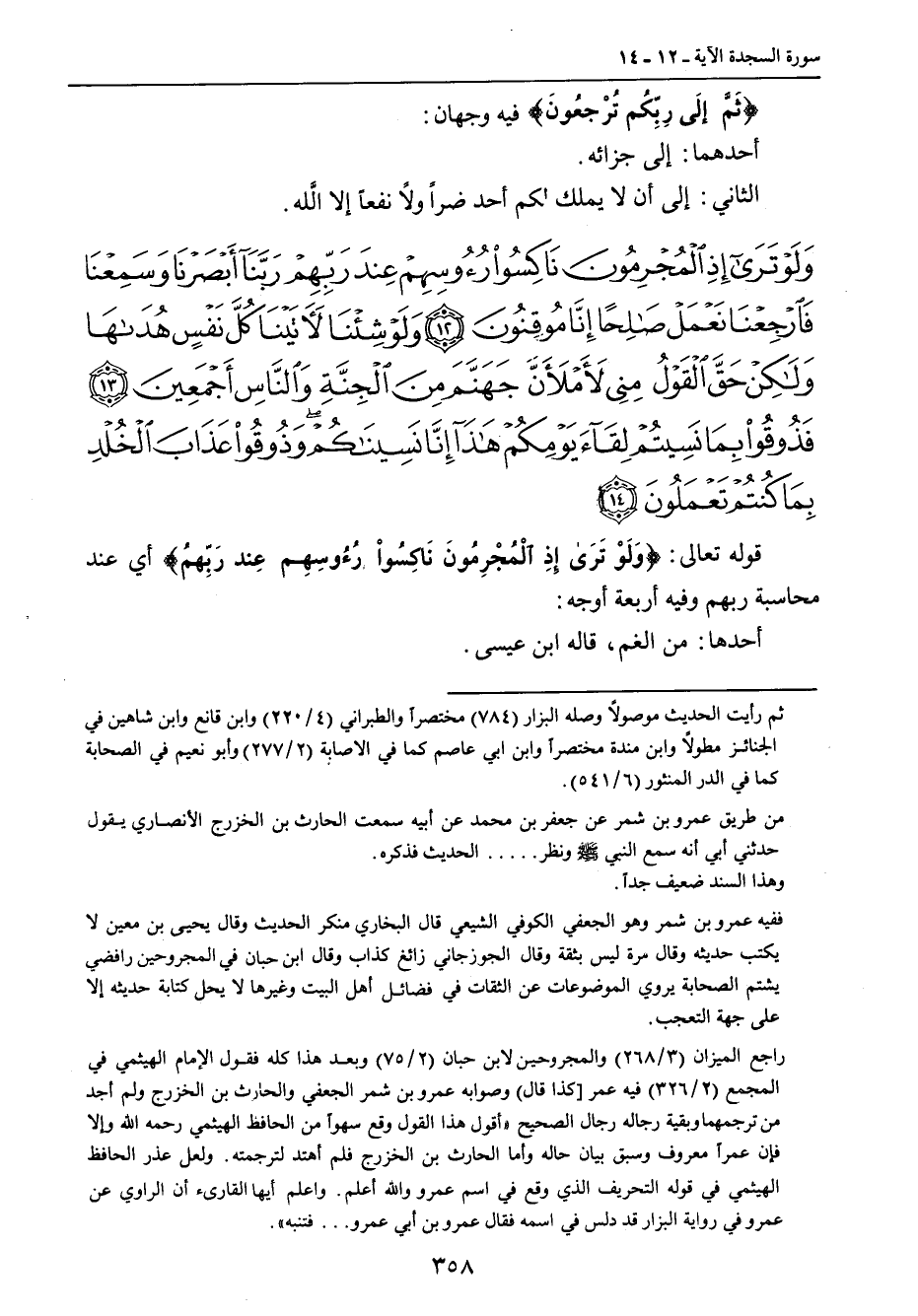 {ولو ترى إذ المجرمون ناكسو رؤوسهم عند ربهم ربنا أبصرنا وسمعنا فارجعنا نعمل صالحا إنا موقنون ولو شئنا لآتينا كل نفس هداها ولكن حق القول مني لأملأن جهنم من الجنة والناس أجمعين فذوقوا بما نسيتم لقاء يومكم هذا إنا نسيناكم وذوقوا عذاب الخلد بما كنتم تعملون} قوله تعالى: {وَلَوْ تَرَى إِذِ الْمُجْرِمُونَ نَاكِسُواْ رُءُسِهِم عِند رَبِّهمُ} أي عند محاسبة ربهم وفيه أربعة أوجه: أحدها: من الغم، قاله ابن عيسى.