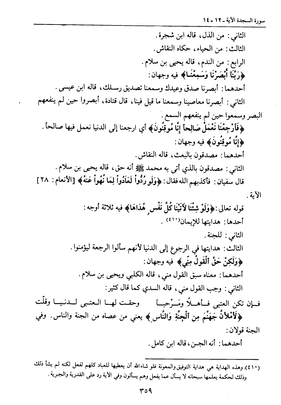 الثاني: من الذل، قاله ابن شجرة. الثالث: من الحياء، حكاه النقاش. الرابع: من الندم، قاله يحيى بن سلام. {رَبَّنَآ أَبْصَرْنَا وَسَمِعْنَا} فيه وجهان: أحدهما: أبصرنا صدق وعيدك وسمعنا تصديق رسلك , قاله ابن عيسى. الثاني: أبصرنا معاصينا وسمعنا ما قيل فينا , قال قتادة , أبصروا حين لم ينفعهم البصر وسمعوا حين لم ينفعهم السمع. {فَارْجِعْنَا نَعْمَلْ صَالِحاً إِنَّا مُوقِنُونَ} أي ارجعنا إلى الدنيا نعمل فيها صالحاً. {إِنَّا مُوقِنُونَ} فيه وجهان: أحدهما: مصدقون بالبعث , قاله النقاش. الثاني: مصدقون بالذي أتي به محمد صلى الله عليه وسلم أنه حق , قاله يحيى بن سلام. قال سفيان: فأكذبهم الله فقال: {وَلَو رُدُّواْ لَعَادُواْ لِمَا نُهُواْ عَنهُ} [الأنعام: 28] الآية. قوله تعالى: {وَلَوْ شِئْنَا لآتَيْنَا كُلَّ نَفْسٍٍ هُدَاهَا} فيه ثلاثة أوجه: أحدها: هدايتها للإيمان. الثاني: للجنة. الثالث: هدايتها في الرجوع إلى الدنيا لأنهم سألوا الرجعة ليؤمنوا. {وَلَكِنْ حَقَّ الْقَولُ مِنِّي} فيه وجهان: أحدهما: معناه سبق القول مني , قاله الكلبي ويحيى بن سلام. الثاني: وجب القول مني , قاله السدي كما قال كثير: