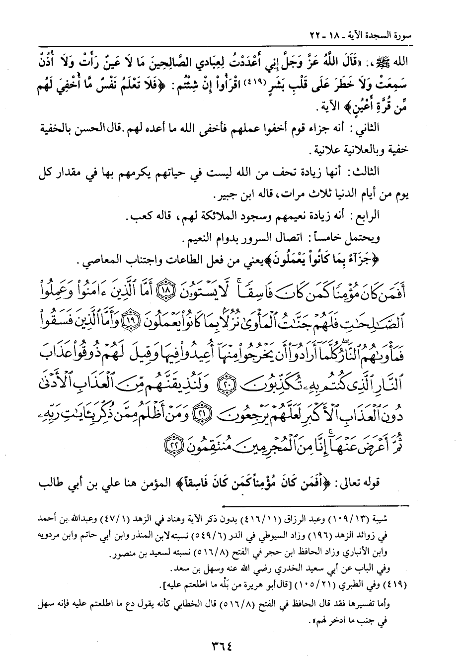 {أفمن كان مؤمنا كمن كان فاسقا لا يستوون أما الذين آمنوا وعملوا الصالحات فلهم جنات المأوى نزلا بما كانوا يعملون وأما الذين فسقوا فمأواهم النار كلما أرادوا أن يخرجوا منها أعيدوا فيها وقيل لهم ذوقوا عذاب النار الذي كنتم به تكذبون ولنذيقنهم من العذاب الأدنى دون العذاب الأكبر لعلهم يرجعون ومن أظلم ممن ذكر بآيات ربه ثم أعرض عنها إنا من المجرمين منتقمون} قوله تعالى: {أَفَمَن كَانَ مُؤْمِناً كَمَن كَانَ فَاسِقاً} المؤمن هنا علي بن أبي طالب