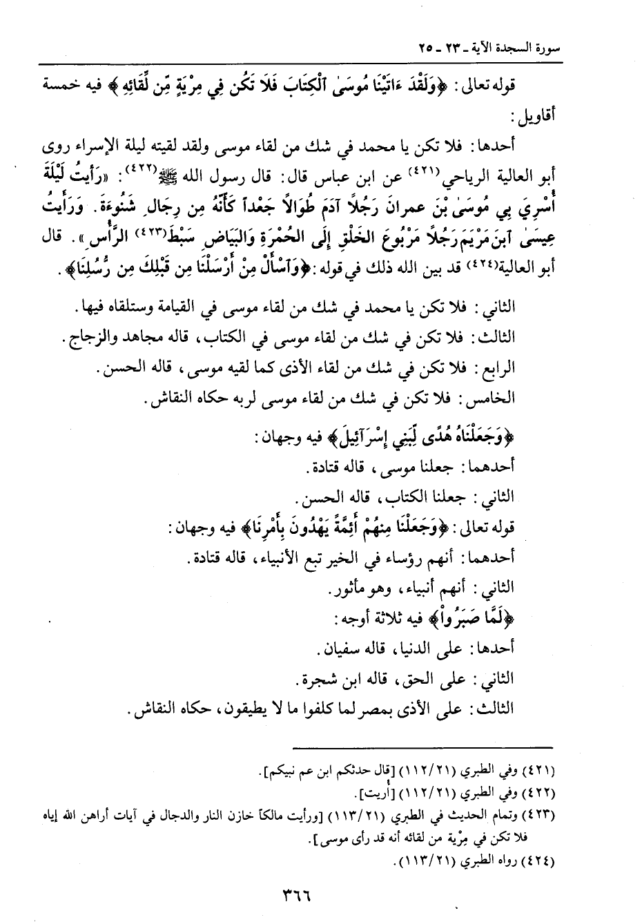 قوله تعالى: {وَلَقْدَءَاتَيْنَا مُوسَى الْكَتِابَ فَلاَ تَكُن فِي مِرْيَةٍ مِّن لِّقَائِهِ} فيه خمسة أقاويل: أحدها: فلا تكن يا محمد في شك من لقاء موسى ولقد لقيته ليلة الإسراء روى أبو العالية الرياحي عن ابن عباس قال: قال رسول الله صلى الله عليه وسلم: (رَأيتُ لَيْلَةَ أُسْرِيَ بِي مُوسَى بْنَ عمرانَ رَجُلاً طُوَالاً جَعْداً كَأَنَّهُ مِن رِجَالِ شَنُوءَةَ. وَرَأَيْتُ عِيسَى ابنَ مَرْيَمَ رَجُلاً مَرْبُوعَ الخَلْقِ إِلَى الحُمْرَةِ وَالبَيَاضِ سَبْطَ الرَّأُسِ) قال أبو العالية قد بين الله ذلك في قوله: {وَاسْأَلْ مِنْ أَرْسَلْنَا مِن قَبْلِكَ مِن رُّسُلِنَا}. الثاني: فلا تكن يا محمد في شك من لقاء موسى في القيامة وستلقاه فيها. الثالث: فلا تكن في شك من لقاء موسى في الكتاب , قاله مجاهد والزجاج. الرابع: فلا تكن في شك من لقاء الأذى كما لقيه موسى , قاله الحسن. الخامس: فلا تكن في شك من لقاء موسى لربه حكاه النقاش.