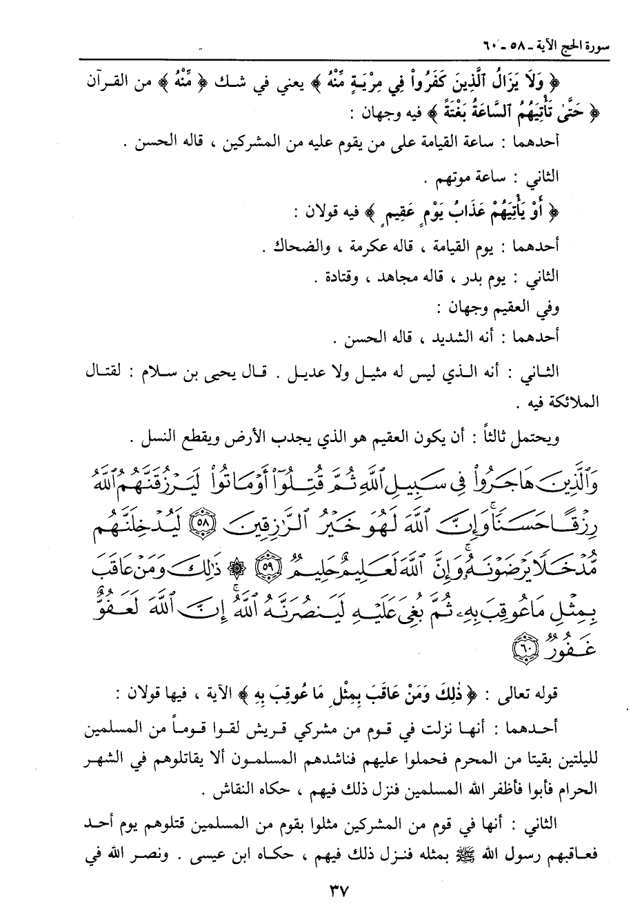 {والذين هاجروا في سبيل الله ثم قتلوا أو ماتوا ليرزقنهم الله رزقا حسنا وإن الله لهو خير الرازقين ليدخلنهم مدخلا يرضونه وإن الله لعليم حليم ذلك ومن عاقب بمثل ما عوقب به ثم بغي عليه لينصرنه الله إن الله لعفو غفور} قوله تعالى: {ذلِكَ وَمَنْ عَاقَبَ بِمِثْلِ مَا عُوقِبَ بِهِ} الآية , فيها قولان: أحدهما: أنها نزلت في قوم من مشركي قريش لقوا قوماً من المسلمين لليلتين بقيتا من المحرم فحملوا عليهم فناشدهم المسلمون ألا يقاتلوهم في الشهر الحرام فأبوا فأظفر الله المسلمين فنزل ذلك فيهم , حكاه النقاش. الثاني: أنها في قوم من المشركين مثلوا بقوم من المسلمين قتلوهم يوم أحد فعاقبهم رسول الله صلى الله عليه وسلم بمثله فنزل ذلك فيهم , حكاه ابن عيسى. ونصر الله في