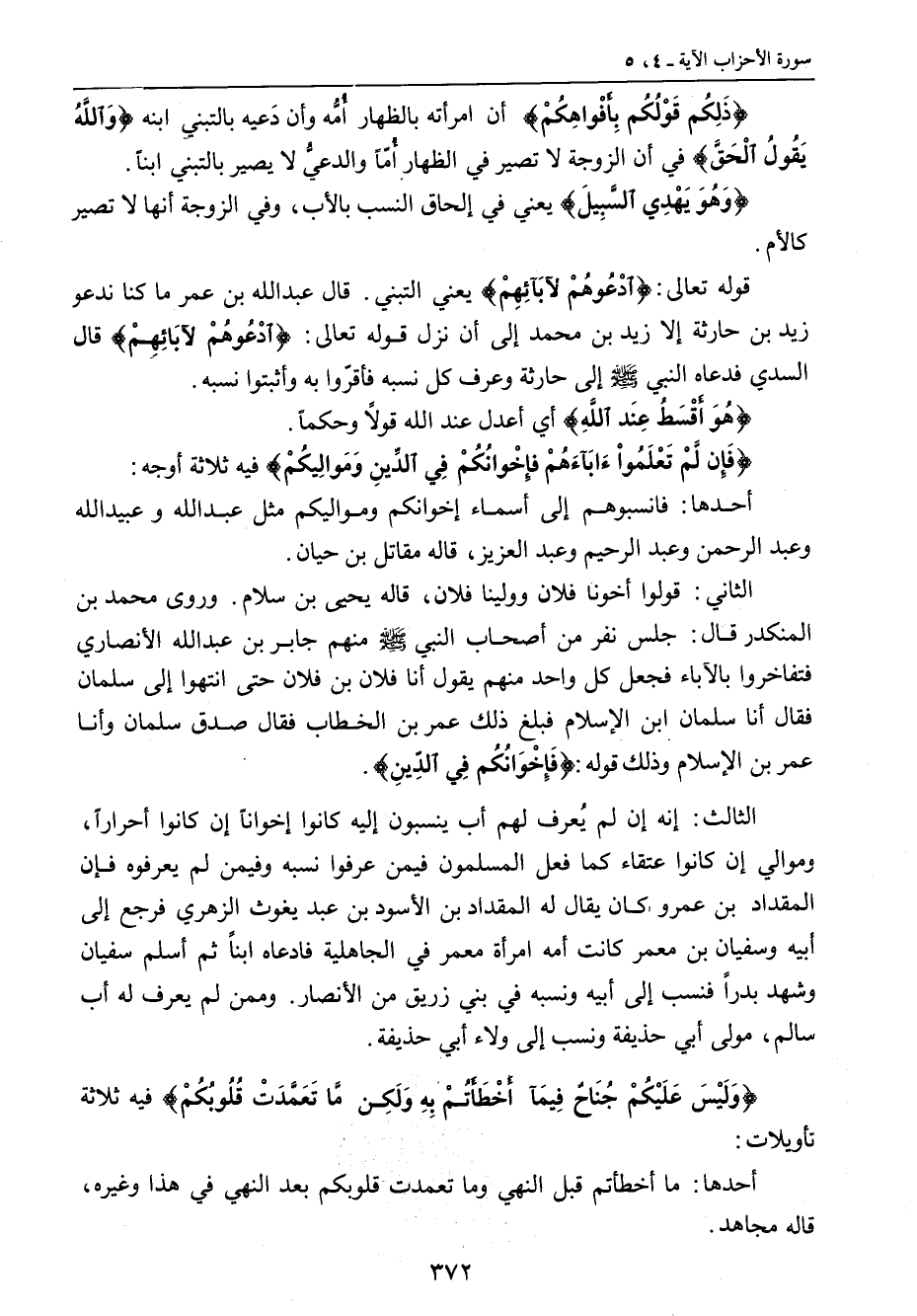 {ذَلِكُم قَوْلُكُم بِأَفْواهِكُمْ} أن امرأته بالظهار أُمُّه وأن دَعيه بالتبني ابنه {وَاللَّهُ يَقُولُ الْحَقَّ} في أن الزوجة لا تصير في الظهار أُمّاً والدعيُّ لا يصير بالتبني ابناً. {وَهُوَ يَهْدِي السَّبِيلَ} يعني في إلحاق النسب بالأب , وفي الزوجة أنها لا تصير كالأم. قوله تعالى: {ادْعُوهُمْ لآبآئِهِمْ} يعني التبني: قال عبد الله بن عمر ما كنا ندعو زيد بن حارثة إلا زيد بن محمد إلى أن نزل قوله تعالى: {ادْعُوهُمْ لآبَائِهِمْ} قال السدي فدعاه النبي صلى الله عليه وسلم إلى حارثة وعرف كل نسبه فأقرّوا به وأثبتوا نسبه. {هُوَ أَقْسَطُ عِنَد اللهِ} أي أعدل عند الله قولاً وحكماً. {فَإِنَ لَّمْ تَعْلَمُواْءَابَآءَهُمْ فإِخْوَانُكُمْ فِي الدِّينِ وَمَوالِيكُمْ} فيه ثلاثة أوجه: أحدها: فانسبوهم إلى أسماء إخوانكم ومواليكم مثل عبد الله وعبيد الله وعبد الرحمن وعبد الرحيم وعبد العزيز , قاله مقاتل بن حيان. الثاني: قولوا أخونا فلان وولينا فلان , قاله يحيى بن سلام. وروى محمد بن المنكدر قال: جلس نفر من أصحاب النبي صلى الله عليه وسلم منهم جابر بن عبد الله الأنصاري فتفاخروا بالآباء فجعل كل واحد منهم يقول أنا فلان بن فلان حتى انتهوا إلى سلمان فقال أنا سلمان ابن الإسلام فبلغ ذلك عمر بن الخطاب فقال صدق سلمان وأنا عمر بن الإسلام وذلك قوله: {فَإِخْوَانُكُمْ فِي الدِّينِ}. الثالث: إنه إن لم يُعرف لهم أب ينسبون إليه كانوا إخواناً إن كانوا أحراراً , وموالي إن كانوا عتقاء كما فعل المسلمون فيمن عرفوا نسبه وفيمن لم يعرفوه فإن المقداد بن عمرو كان يقال له المقداد بن الأسود بن عبد يغوث الزهري فرجع إلى أبيه وسفيان بن معمر كانت أمه امرأة معمر في الجاهلية فادعاه ابناً ثم أسلم سفيان وشهد بدراً فنسب إلى أبيه ونسبه في بني زريق من الأنصار. وممن لم يعرف له أب سالم، مولى أبي حذيفة ونسب إلى ولاء أبي حذيفة. {وَلَيْسَ عَلَيْكُمْ جُنَاحٌ فِيمَآ أَخْطَأَتُمْ بِهِ وَلَكِن مَّا تَعَمَّدَتْ قُلُوبُكُمْ} فيه ثلاثة تأويلات: أحدها: ما أخطأتم قبل النهي وما تعمدت قلوبكم بعد النهي في هذا وغيره، قاله مجاهد.
