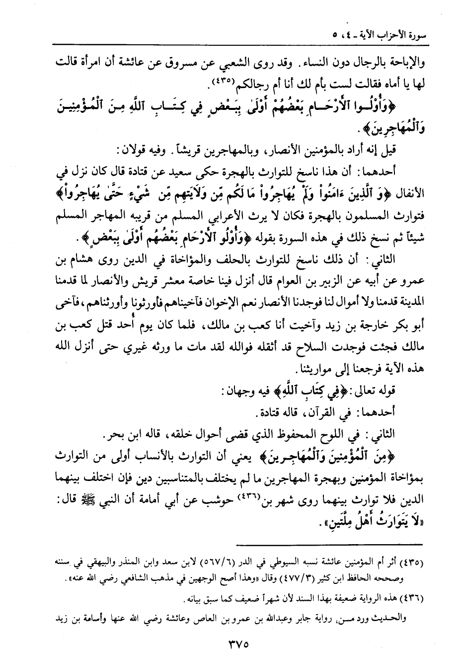 والإباحة بالرجال دون النساء. وقد روى الشعبي عن مسروق عن عائشة أن امرأة قالت لها يا أماه فقالت لست بأم لك أنا أم رجالكم. {وَأُوْلُواْ الأَرْحَامِ بَعْضُهُمْ أَوْلَى بِبَعْضٍ فِي كِتَابِ اللَّهِ مِنَ الْمُؤْمِنِينَ وَالْمُهَاجرِينَ}. قيل إنه أراد بالمؤمنين الأنصار , وبالمهاجرين قريشاً. وفيه قولان: أحدهما: أن هذا ناسخ للتوارث بالهجرة حكى سعيد عن قتادة قال كان نزل في الأنفال {وَالَّذِينَءَامَنُواْ وَلَمْ يُهَاجِرُواْ مَا لَكُمْ مِّن وَلاَيَتهِمْ مِّن شَيْءٍ حَتَّى يُهَاجِرُواْ} فتوارث المسلمون بالهجرة فكان لا يرث الأعرابي المسلم من قريبه المهاجر المسلم شيئاً ثم نسخ ذلك في هذه السورة بقوله {وَأُوْلُواْ الأَرْحَامِ بَعْضُهُم أَوْلَى بِبَعْضٍ}. الثاني: أن ذلك ناسخ للتوارث بالحلف والمؤاخاة في الدين روى هشام بن عمرو عن أبيه عن الزبير بن العوام قال أنزل فينا خاصة معشر قريش والأنصار لما قدمنا المدينة قدمناه ولا أموال لنا فوجدنا الأنصار نعم الإخوان فآخيناهم فأورثونا وأورثناهم , فآخى أبو بكر خارجة بن زيد وآخيت أنا كعب بن مالك , فلما كان يوم أُحد قتل كعب بن مالك فجئت فوجدت السلاح قد أثقله فوالله لقد مات ما ورثه غيري حتى أنزل الله هذه الآية فرجعنا إلى مواريثنا. قوله تعالى: {فِي كِتَابِ اللَّهِ} فيه وجهان: أحدهما: في القرآن , قاله قتادة. الثاني: في اللوح المحفوظ الذي قضى أحوال خلقه , قاله ابن بحر. {مِنَ الْمُؤْمِنِينَ وَالْمُهَاجِرِينَ} يعني أن التوارث بالأنساب أولى من التوارث بمؤاخاة المؤمنين وبهجرة المهاجرين ما لم يختلف بالمتناسبين دين فإن اختلف بينهما الدين فلا توارث بينهما روى شهر بن حوشب عن أبي أمامة أن النبي صلى الله عليه وسلم قال: (لاَ يَتَوَارَثُ أَهْلُ مِلَّتِينِ).