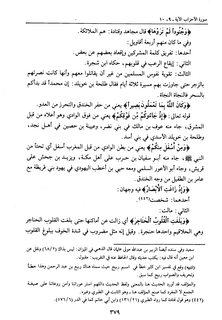 {وَجُنُوداً لَمْ تَرَوْهَا} قال مجاهد وقتادة: هم الملائكة. وفي ما كان منهم أربعة أقاويل: أحدها: تفريق كلمة المشركين وإقعاد بعضهم عن بعض. الثاني: إيقاع الرعب في قلوبهم , حكاه ابن شجرة. الثالث: تقوية نفوس المسلمين من غير أن يقاتلوا معهم وأنها كانت نصرتهم بالزجر حتى جاوزت بهم مسيرة ثلاثة أيام فقال طلحة بن خويلد: إن محمداً قد بدأكم بالسحر فالنجاة النجاة. {وَكَانَ اللَّهُ بِمَا تَعْمَلُونَ بَصِيراً} يعني من حفر الخندق والتحرز من العدو. قوله تعالى: {إِذْ جَآءُوكُمْ مِّن فَوْقِكُمْ} يعني من فوق الوادي وهو أعلاه من قبل المشرق , جاء منه عوف بن مالك في بني نضر , وعيينة بن حصين في أهل نجد , وطلحة بن خويلد الأسدي في بني أسد. {وَمِنْ أَسْفَلَ مِنكُمْ} يعني من بطن الوادي من قبل المغرب أسفل أي تحتاً من النبي صلى الله عليه وسلم , جاء منه أبو سفيان بن حرب على أهل مكة , ويزيد بن جحش على قريش , وجاء أبو الأعور السلمي ومعه حيي بن أخطب اليهودي في يهود بني قريظة مع عامر بن الطفيل من وجه الخندق. {وَإِذْ زَاغَتِ الأَبْصَارُ} فيه وجهان: أحدهما: شخصت. الثاني: مالت: {وَبَلَغَتِ الْقُلُوبِ الْحَنَاجِرَ} أي زالت عن أماكنها حتى بلغت القلوب