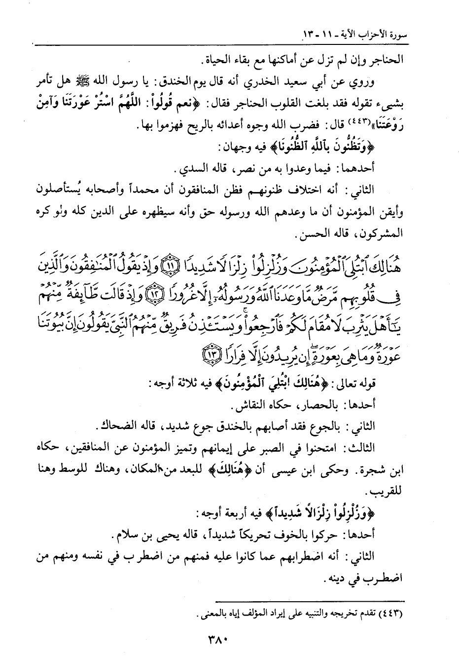 {هنالك ابتلي المؤمنون وزلزلوا زلزالا شديدا وإذ يقول المنافقون والذين في قلوبهم مرض ما وعدنا الله ورسوله إلا غرورا وإذ قالت طائفة منهم يا أهل يثرب لا مقام لكم فارجعوا ويستأذن فريق منهم النبي يقولون إن بيوتنا عورة وما هي بعورة إن يريدون إلا فرارا} قوله تعالى: {هُنَالِكَ ابْتُلِيَ الْمُؤْمِنُونَ} فيه ثلاثة أوجه: أحدها: بالحصر , حكاه النقاش. الثاني: بالجوع فقد أصابهم بالخندق جوع شديد , قاله الضحاك. الثالث: امتحنوا في الصبر على إيمانهم وتميز المؤمنون عن المنافقين , حكاه ابن شجرة. وحكى ابن عيسى أن {هُنالِكَ} للبعد من المكان , وهناك للوسط وهنا للقريب. {وَزُلْزِلُواْ زِلْزَالاً شَدِيداً} فيه أربعة أوجه: أحدها: حركوا بالخوف تحريكاً شديداً , قاله يحيى بن سلام. الثاني: أنه اضطرابهم عما كانوا عليه فمنهم من اضطرب في نفسه ومنهم من اضطرب في دينه.