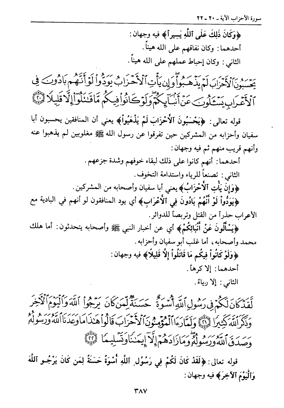 {لقد كان لكم في رسول الله أسوة حسنة لمن كان يرجو الله واليوم الآخر وذكر الله كثيرا ولما رأى المؤمنون الأحزاب قالوا هذا ما وعدنا الله ورسوله وصدق الله ورسوله وما زادهم إلا إيمانا وتسليما} قوله تعالى: {لَقَدْ كَانَ لَكُمْ فِي رَسُوُلِ اللَّهِ أُسْوَةٌ حَسَنَةٌ لِمَن كَانَ يَرْجُو اللَّهَ وَالْيَوْمَ الآخِرَ} فيه وجهان: