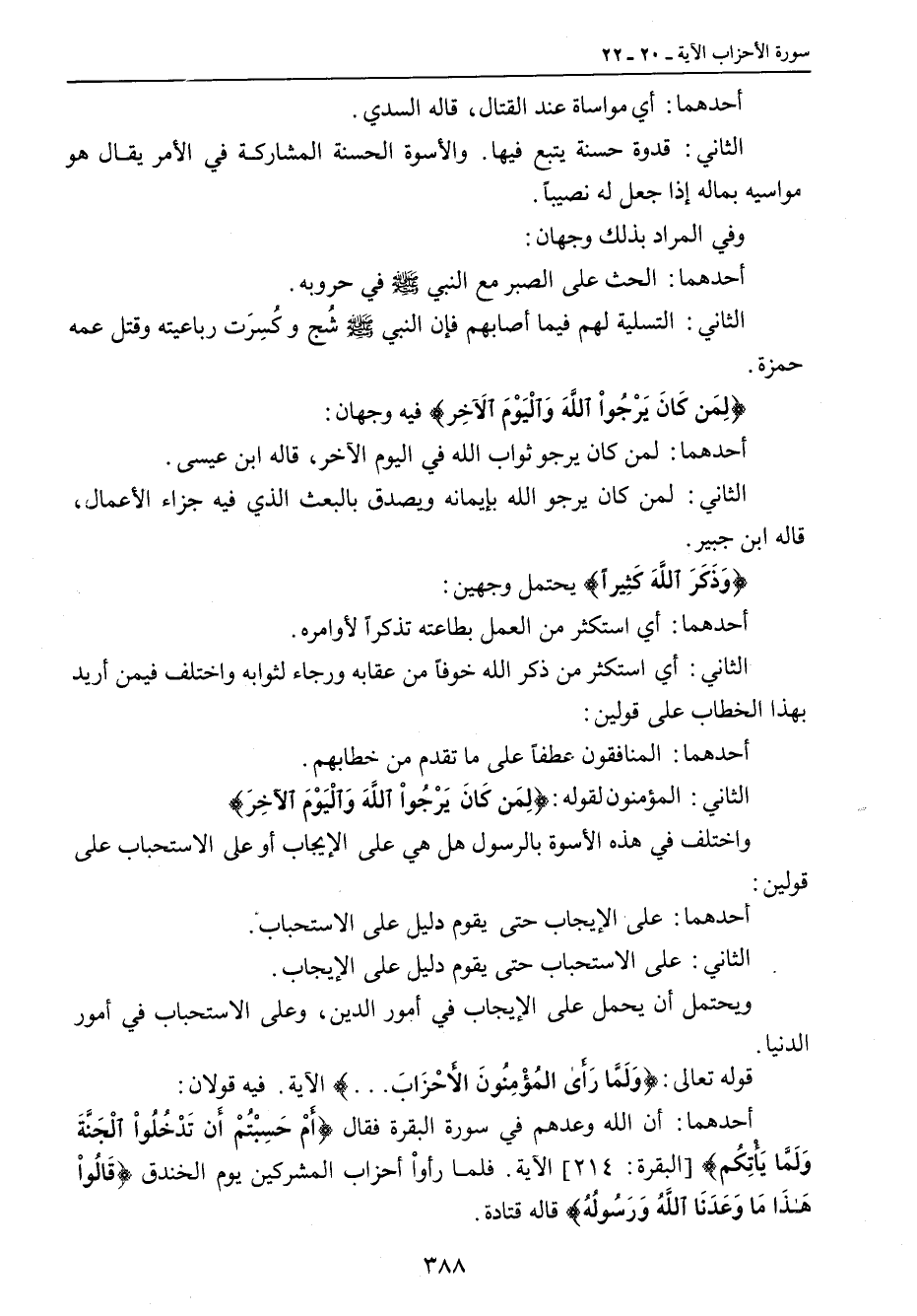 أحدهما: أي مواساة عند القتال , قاله السدي. الثاني: قدوة حسنة يتبع فيها , والأسوة الحسنة المشاركة في الأمر يقال هو مواسيه بماله إذا جعل له نصيباً. وفي المراد بذلك وجهان: أحدهما: الحث على الصبر مع النبي صلى الله عليه وسلم في حروبه. الثاني: التسلية لهم فيما أصابهم فإن النبي صلى الله عليه وسلم شُج وكُسِرَت رباعيته وقتل عمه حمزة. {لِمَن كَانَ يَرْجُواْ اللَّهَ وَالْيَوْمَ الآخِر} فيه وجهان: أحدهما: لمن كان يرجو ثواب الله في اليوم الآخر قاله ابن عيسى. الثاني: لمن كان يرجوا الله بإيمانه ويصدق بالبعث الذي فيه جزاء الأعمال , قاله ابن جبير. {وَذَكَرَ اللَّهَ كَثِيراً} يحتمل وجهين: أحدهما: أي استكثر من العمل بطاعته تذكراً لأوامره. الثاني: أي استكثر من ذكر الله خوفاً من عقابه ورجاء لثوابه واختلف فيمن أريد بهذا الخطاب على قولين: أحدهما: المنافقون عطفاً عل ما تقدم من خطابهم. الثاني: المؤمنون لقوله: {لِمَن كَانَ يَرْجُواْ اللَّهَ وَالْيَوْمَ الآخِرَ}. واختلف في هذه الأسوة بالرسول هل هي على الإِيجاب أو على الاستحباب على قولين: أحدهما: على الإيجاب حتى يقوم دليل علىالاستحباب. الثاني: على الاستحباب حتى يقول دليل على الإيجاب. ويحتمل أن يحمل على الإيجاب في أمور الدين , وعلى الاستحباب في أمور الدنيا. قوله تعالى: {وَلَمَّا رَأَى المُؤْمِنُونَ الأحْزَابِ ... } الآية. فيه قولان: أحدهما: أن الله وعدهم في سورة البقرة فقال {أَمْ حَسِبْتُمْ أَن تَدْخُلُواْ الْجَنَّةَ وَلَمَّا يَأْتِكُم} [البقرة: 214] الآية. فلما رأواْ أحزاب المشركين يوم الخندق {قَالُواْ هَذَا مَا وَعَدَنَا اللَّهُ وَرَسُولُهُ} قاله قتادة.