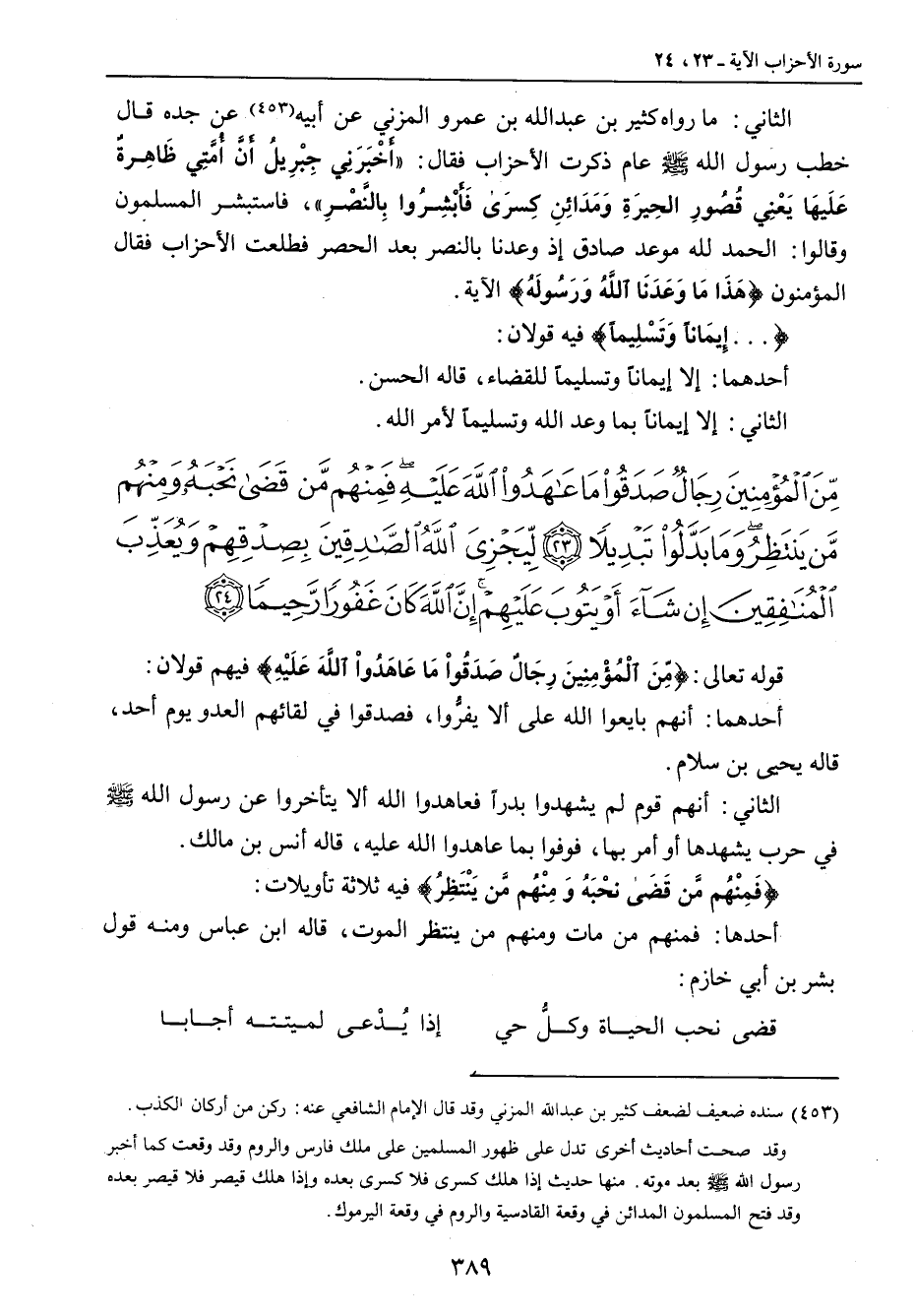 {من المؤمنين رجال صدقوا ما عاهدوا الله عليه فمنهم من قضى نحبه ومنهم من ينتظر وما بدلوا تبديلا ليجزي الله الصادقين بصدقهم ويعذب المنافقين إن شاء أو يتوب عليهم إن الله كان غفورا رحيما} قوله تعالى: {مِّنَ الْمُؤْمِنِينَ رِجَالٌ صَدَقُواْ مَا عَاهَدُواْ اللَّهَ عَلَيْهِ} فيهم قولان: أحدهما: أنهم بايعوا الله على ألا يفرُّوا، فصدقوا في لقائهم العدو يوم أحد , قاله يحيى بن سلام. الثاني: أنهم قوم لم يشهدوا بدراً فعاهدوا الله ألا يتأخروا عن رسول الله صلى الله عليه وسلم في حرب يشهدها أو أمر بها، فوفوا بما عاهدوا الله عليه , قاله أنس بن مالك. {فَمِنْهُم مَّن قَضَى نحْبَهُ وَمِنْهُم مَّن يَنْتَظِرُ} فيه ثلاثة تأويلات: أحدها: فمنهم من مات ومنهم من ينتظر الموت، قاله ابن عباس ومنه قول بشر بن أبي خازم: