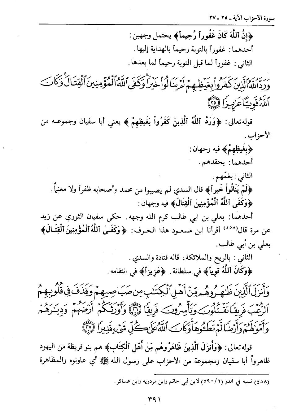 {ورد الله الذين كفروا بغيظهم لم ينالوا خيرا وكفى الله المؤمنين القتال وكان الله قويا عزيزا} قوله تعالى: {وَرَدَّ اللَّهُ الَّذِينَ كَفَرُواْ بَغَيظِهِمْ} يعني أبا سفيان وجموعه من الأحزاب. {بِغَيظِهِمْ} فيه وجهان: أحدهما: بحقدهم. الثاني: بغمّهم. {لَمْ يَنَالُواْ خَيراً} قال السدي لم يصيبوا من محمد وأصحابه ظفراً ولا مغنماً. {وَكَفَى اللَّهُ الْمُؤْمِنِينَ الْقِتَالَ} فيه وجهان: أحدهما: بعلي بن أبي طالب كرم الله وجهه. حكى سفيان الثوري عن زيد عن مرة قال أقرأنا ابن مسعود هذا الحرف: {وَكَفَى اللَّهُ الْمُؤْمِنِينَ الْقِتَالَ} بعلي بن أبي طالب. الثاني: بالريح والملائكة , قاله قتادة والسدي. {وََكَانَ اللَّهُ قَوِياً} في سلطانه. {عَزِيزاً} في انتقامه.