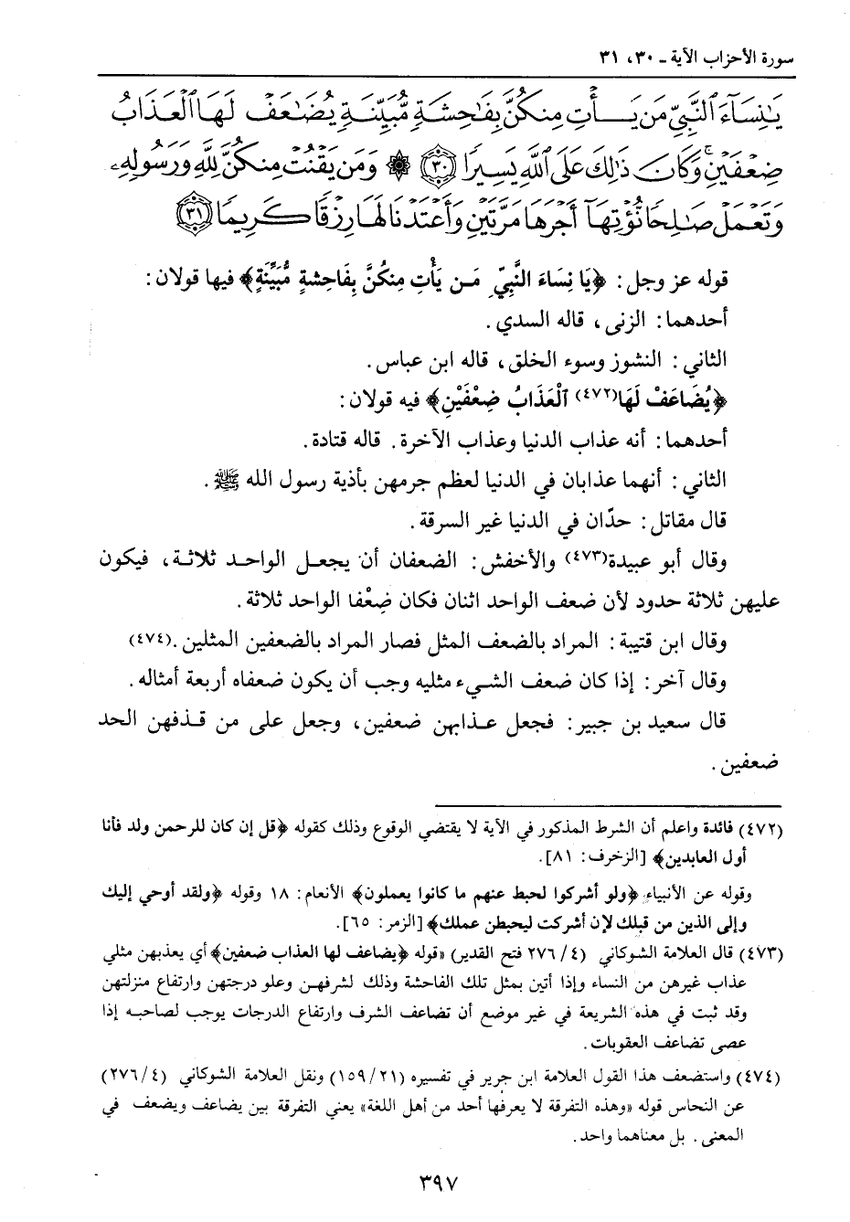 {يا نساء النبي من يأت منكن بفاحشة مبينة يضاعف لها العذاب ضعفين وكان ذلك على الله يسيرا ومن يقنت منكن لله ورسوله وتعمل صالحا نؤتها أجرها مرتين وأعتدنا لها رزقا كريما} قوله عز وجل: {يَا نِسَاءَ النَّبِيِّ مَن يَأْتِ مِنكُنَّ بِفَاحِشةٍ مُّبَيِّنَةٍ} فيها قولان: أحدهما: الزنى , قاله السدي. الثاني: النشوز وسوء الخلق , قاله ابن عباس. {يُضَاعَفْ لَهَا الْعَذَابُ ضِعْفَيْنِ} فيه قولان: أحدهما: أنه عذاب الدنيا وعذاب الآخرة , قاله قتادة. الثاني: أنهما عذابان في الدنيا لعظم جرمهن بأذية رسول الله صلى الله عليه وسلم. قال مقاتل: حدّان في الدنيا غير السرقة. وقال أبو عبيدة والأخفش: الضعفان أن يجعل الواحد ثلاثة , فيكون عليهن ثلاثة حدود لأن ضعف الواحد اثنان فكان ضِعْفا الواحد ثلاثة. وقال ابن قتيبة: المراد بالضعف المثل فصار المراد بالضعفين المثلين. وقال آخر: إذا كان ضعف الشيء مثليه وجب بأن يكون ضعفاه أربعة أمثاله. قال سعيد بن جبير: فجعل عذابهن ضعفين , وجعل على من قذفهن الحد ضعفين.