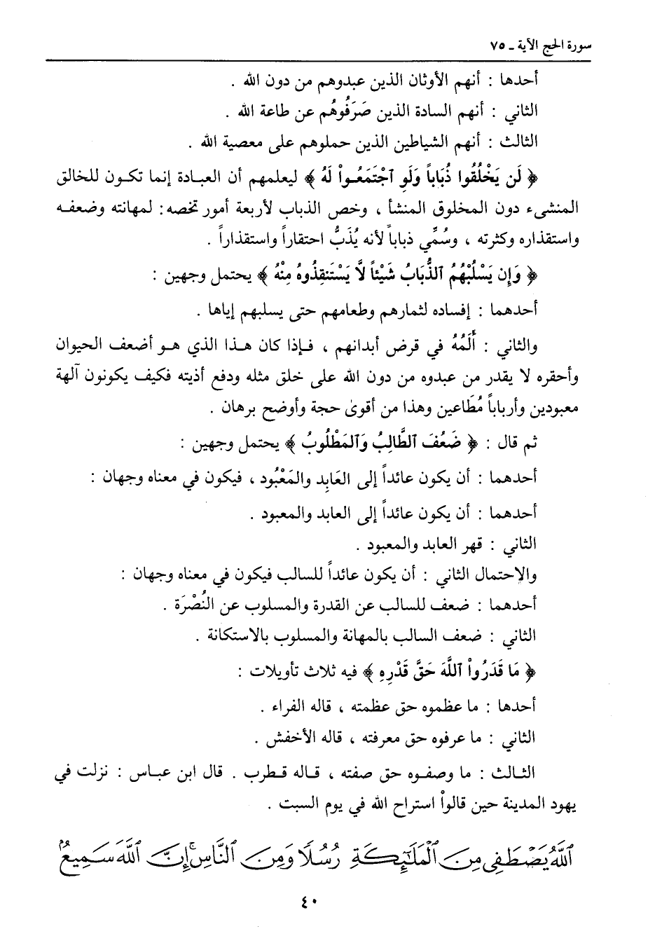 أحدها: أنهم الأوثان الذين عبدوهم من دون الله. الثاني: أنهم السادة الذين صَرَفُوهُم عن طاعة الله. الثالث: أنهم الشياطين الذين حملوهم على معصية الله. {لَن يَخْلُقُوا ذُبَاباً وَلَوِ اجْتَمَعُواْ لَهُ} ليعلمهم أن العبادة إنما تكون للخالق المنشىء دون المخلوق المنشأ , وخص الذباب لأربعة أمور تخصه: لمهانته وضعفه واستقذاره وكثرته , وسُمِّي ذباباً لأنه يُذَبُّ احتقاراً واستقذاراً. {وَإِن يَسْلُبْهُمُ الذُّبَابُ شَيْئاً لاَّ يَسْتَنقِذُوهُ مِنْهُ} يحتمل وجهين: أحدهما: إفساده لثمارهم وطعامهم حتى يسلبهم إياها. والثاني: أَلَمُهُ في قرض أبدانهم , فإذا كان هذا الذي هو أضعف الحيوان وأحقره لا يقدر من عبدوه من دون الله على خلق مثله ودفع أذيته فكيف يكونون آلهة معبودين وأرباباً مُطَاعين وهذا من أقوى حجة وأوضح برهان. ثم قال: {ضَعُفَ الطَّالِبُ وَالمَطْلُوبِ} يحتمل وجهين: أحدهما: أن يكون عائداً إلى العَابِد والمَعْبُود , فيكون في معناه وجهان: أحدهما: أن يكون عائداً إلى العابد والمعبود. الثاني: قهر العابد والمعبود. والاحتمال الثاني: أن يكون عائداً للسالب فيكون في معناه وجهان: أحدهما: ضعف للسالب عن القدرة والمسلوب عن النُصْرَة. الثاني: ضعف السالب بالمهانة والمسلوب بالاستكانة. {وَمَا قَدَرُواْ اللَّهَ حَقَّ قَدْرِهِ} فيه ثلاثة تأويلات: أحدها: ما عظموه حق عظمته , قاله الفراء. الثاني: ما عرفوه حق معرفته , قاله الأخفش. الثالث: ما وصفوه حق صفته , قاله قطرب. قال ابن عباس: نزلت في يهود المدينة حين قالواْ استراح الله في يوم السبت.