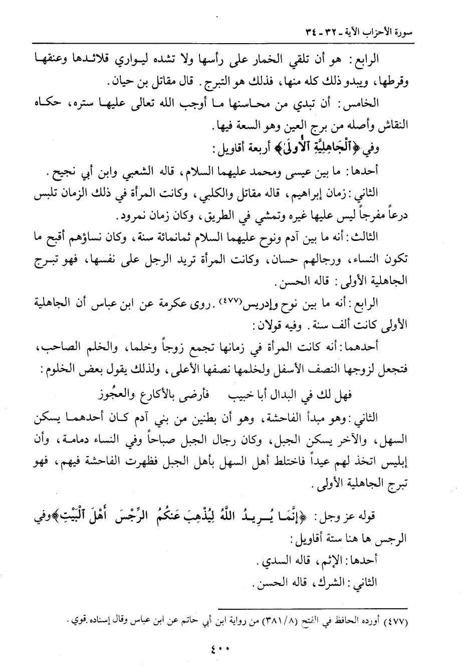 الثاني: وهو مبدأ الفاحشة , وهو أن بطنين من بني آدم كان أحدهما يسكن السهل , والآخر يسكن الجبل، وكان رجال الجبل صباحاً وفي النساء دمامة، وأن إبليس اتخذ لهم عيداً فاختلط أهل السهل بأهل الجبل فظهرت الفاحشة فيهم، فهو تبرج الجاهلية. قوله عز وجل: {إِنَّمَا يُرِيدُ اللَّهُ لِيُذْهِبَ عَنكُمْ الرِّجْسَ أَهْلَ الْبَيْتِ} وفي الرجس ها هنا ستة أقاويل: أحدها: الإثم، قاله السدي. الثاني: الشرك، قاله الحسن.