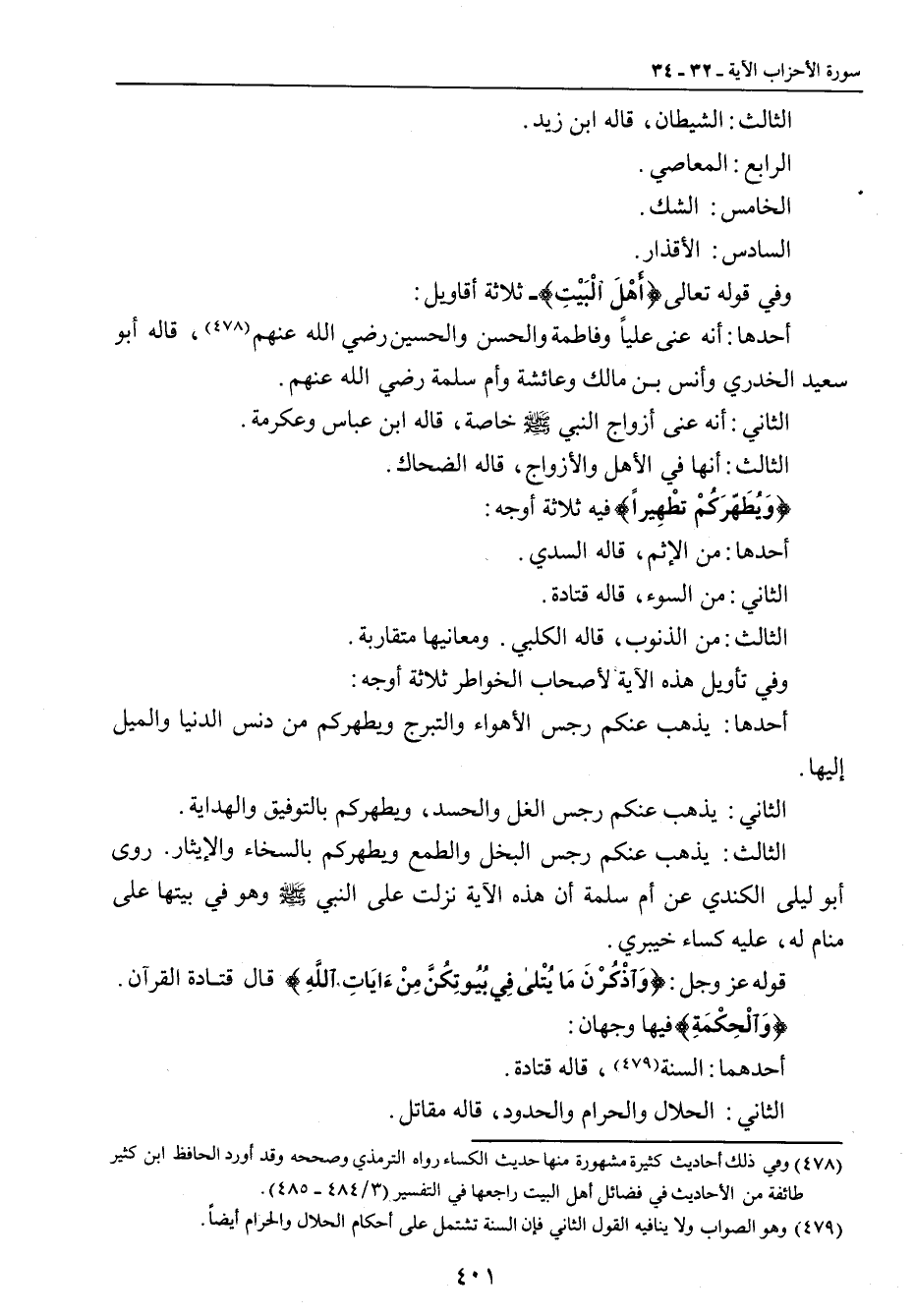 الثالث: الشيطان، قاله ابن زيد. الرابع: المعاصي. الخامس: الشك. السادس: الأقذار. وفي قوله تعالى {أَهْلَ الْبَيْتِ} - ثلاثة أقاويل: أحدها: أنه عنى علياً وفاطمة والحسن والحسين رضي الله عنهم , قاله أبو سعيد الخدري وأنس بن مالك وعائشة وأم سلمة رضي الله عنهم. الثاني: أنه عنى أزواج النبي صلى الله عليه وسلم خاصة , قاله ابن عباس وعكرمة. الثالث: أنها في الأهل والأزواج , قاله الضحاك. {وَيُطَهّرَكُمْ تطْهِيراً} فيه ثلاثة أوجه: أحدها: من الإثم , قاله السدي. الثاني: من السوء , قاله قتادة. الثالث: من الذنوب , قاله الكلبي , ومعانيها متقاربة. وفي تأويل هذه الآية لأصحاب الخواطر ثلاثة أوجه: أحدها: يذهب عنكم رجس الأهواء والتبرج ويطهركم من دنس الدنيا والميل إليها. الثاني: يذهب عنكم رجس الغل والحسد , ويطهركم بالتوفيق والهداية. الثالث: يذهب عنكم رجس البخل والطمع ويطهركم بالسخاء والإيثار , روى أبو ليلى الكندي عن أم سلمة أن هذه الآية نزلت على النبي صلى الله عليه وسلم وهو في بيتها على منام له , عليه كساء خيبري. قوله عز وجل: {وَاذْكُرْنَ مَا يُتْلى فِي بُيُوتِكُنَّ مِنْءَايَاتِ اللَّهِ} قال قتادة القرآن. {وَالْحِكْمَةِ} فيها وجهان: أحدهما: السنة، قاله قتادة. الثاني: الحلال والحرام والحدود، قاله مقاتل.