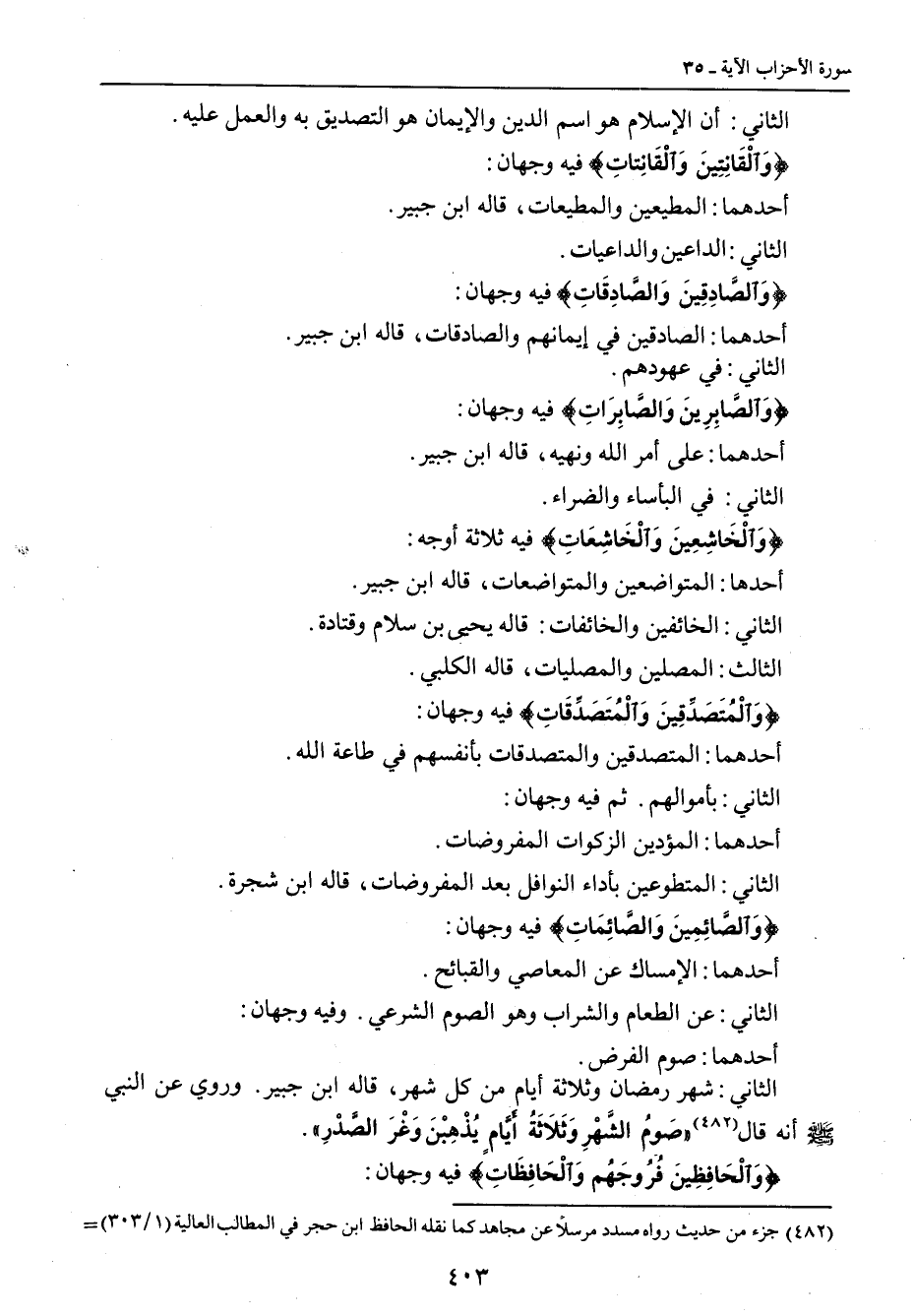 الثاني: أن الإسلام هو اسم الدين والإيمان هو التصديق به والعمل عليه. {وَالْقَانِتِينَ وَالْقَانِتاتِ} فيه وجهان: أحدهما: المطيعين والمطيعات , قاله ابن جبير. الثاني: الداعين والداعيات. {وَالصَّادِقِينَ وَالصَّادِقَاتِ} فيه وجهان: أحدهما: الصادقين في إيمانهم والصادقات , قاله ابن جبير. الثاني: في عهودهم. {وَالصَّابِرِينَ وَالصَّابِرَاتِ} فيه وجهان: أحدهما: على أمر الله ونهيه , قاله ابن جبير. الثاني: في البأساء والضراء. {والْخَاشِعِينَ وَالْخَاشِعَاتِ} فيه ثلاثة أوجه: أحدها: المتواضعين والمتواضعات , قاله ابن جبير. الثاني: الخائفين والخائفات: قاله يحيى بن سلام وقتادة. الثالث: المصلين والمصليات , قاله الكلبي. {وَالْمُتَصَدِّقِينَ وَالْمُتَصَدِّقَاتِ} فيه وجهان: أحدهما: المتصدقين والمتصدقات بأنفسهم في طاعة الله. الثاني: بأموالهم. ثم فيه وجهان: أحدهما: المؤدين الزكوات المفروضات. الثاني: المتطوعين بأداء النوافل بعد المفروضات , قاله ابن شجرة. {وَالصَّائِمِينَ وَالصَّائِمَاتِ} فيه وجهان: أحدهما: الإمساك عن المعاصي والقبائح. الثاني: عن الطعام والشراب وهو الصوم الشرعي. وفيه وجهان: أحدهما: صوم الفرض. الثاني: شهر رمضان وثلاثة أيامٍ من كل شهر , قاله ابن جبير. وروي عن النبي صلى الله عليه وسلم أنه قال: (صَومُ الشَّهْرِ وَثَلاَثَةُ أَيَّامٍ يُذْهِبْنَ وَغْرَ الصَّدْرِ). {وَالْحَافِظِينَ فُرُوجَهُمْ وَالْحَافِظَاتِ} فيه وجهان: