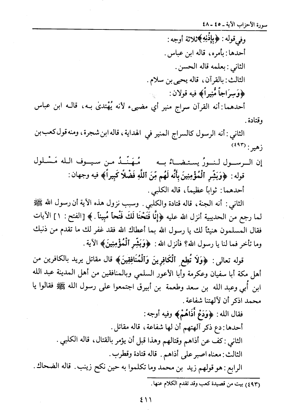 وفي قوله: {بِإِذْنِهِ} ثلاثة أوجه: أحدها: بأمره , قاله ابن عباس. الثاني: بعمله قاله الحسن. الثالث: بالقرآن , قاله يحيى بن سلام. {وَسِرَاجاً مُّنِيراً} فيه قولان: أحدهما: أنه القرآن سراج منير أي مضيء لأنه يُهْتدى به , قاله ابن عباس وقتادة. الثاني: أنه الرسول كالسراج المنير في الهداية , قاله ابن شجرة , ومنه قول كعب بن زهير: