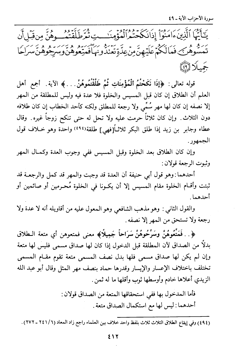 {يا أيها الذين آمنوا إذا نكحتم المؤمنات ثم طلقتموهن من قبل أن تمسوهن فما لكم عليهن من عدة تعتدونها فمتعوهن وسرحوهن سراحا جميلا} قوله تعالى: {إذَا نَكَحْتُمُ الْمُؤْمِنَاتِ ثُمَّ طَلَّقْتُمُوهُنَّ ... } الآية. أجمع أهل العلم أن الطلاق إن كان قبل المسيس والخلوة فلا عدة فيه وليس للمطلقة من المهر إلا نصفه إن كان لها مهر سُمِّي ولا رجعة للمطلق ولكنه كأحد الخطاب إن كان طلاقه دون الثلاث. وإن كان ثلاثاً حرمت عليه ولا تحل له حتى تنكح زوجاً غيره. وقال عطاء وجابر بن زيد إذا طلق البكر ثلاثاً [فهي] طلقة واحدة وهو خلاف قول الجمهور. وإن كان الطلاق بعد الخلوة وقبل المسيس ففي وجوب العدة وكمال المهر وثبوت الرجعة قولان: أحدهما: وهو قول أبي حنيفة أن العدة قد وجبت والمهر قد كمل والرجعة قد ثبتت وأقام الخلوة مقام المسيس إلا أن يكونا في الخلوة مُحرمين أو صائمين أو أحدهما. والقول الثاني: وهو مذهب الشافعي وهو المعول عليه من أقاويله إنه لا عدة ولا رجعة ولا تستحق من المهر إلا نصفه. {. . فَمَتِّعُوهُنَّ وسَرِّحُوهُنَّ سَرَاحاً جَمِيلاً} معنى فمتعوهن أي متعة الطلاق بدلاً من الصداق لأن المطلقة قبل الدخول إذا كان لها صداق مسمى فليس لها متعة وإن لم يكن لها صداق مسمى فلها بدل نصف المسمى متعة تقول مقام المسمى تختلف باختلاف الإعسار والإيسار وقدرها حماد بنصف مهر المثل وقال أبو عبد الله الزيدي أعلاها خادم وأوسطها ثوب وأقلها ما له ثمن. فأما المدخول بها ففي استحقاقها المتعة من الصداق قولان: أحدهما ليس لها مع استكمال الصداق متعة.