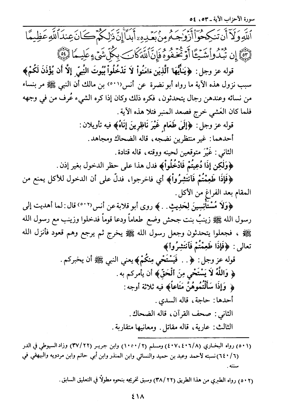 الله ولا أن تنكحوا أزواجه من بعده أبدا إن ذلكم كان عند الله عظيما إن تبدوا شيئا أو تخفوه فإن الله كان بكل شيء عليما} قوله عز وجل: {يَأَيُّهَا الَّذِينَءَامُنُواْ لاَ تَدْخُلُواْ بُيُوتَ النَّبِيِّ إلاَّ أَن يُؤذَنَ لَكُمْ} سبب نزل هذه الآية ما رواه أبو نضرة عن أنس بن مالك أن النبي صلى الله عليه وسلم مر بنساء من نسائه وعندهن رجال يتحدثون , فكره ذلك وكان إذا كره الشىء عُرف من وجهه فلما كان العَشي خرج فصعد المنبر فتلا هذه الآية. قوله عز وجل: {إِلَى طَعَامِ غَيْرَ نَاظِرينَ إِنَاهُ} فيه تأويلان: أحدهما: غير منتظرين نضجه , قاله الضحاك ومجاهد. الثاني: غَيْرَ متوقعين لحينه ووقته , قاله قتادة. {وَلكِن إذَا دُعِيتُمْ فَادْخُلُواْ} فدل هذا على حظر الدخول بغير إذن. {فَإذَا طَعِمْتُمْ فآنتَشِرُواْ} أي فاخرجوا , فدلّ على أن الدخول للأكل يمنع من المقام بعد الفراغ من الأكل. {وَلاَ مُسْتَأْنِسِينَ لِحَدِيثٍ ... } روى أبو قلابة عن أنس. قال: لما أهديت إلى رسول الله صلى الله عليه وسلم زينبُ بنت جحش وضع طعاماً ودعا قوماً فدخلوا وزينب مع رسول الله صلى الله عليه وسلم , فجعلوا يتحدثون وجعل رسول الله صلى الله عليه وسلم يخرج ثم يرجع وهم قعود فأنزل الله تعالى: {فَإذَا طَعِمْتُمْ فَانتَشِرُواْ}. قوله عز وجل: {. . فَيَسْتَحْي مِنكُمْ} يعني النبي صلى الله عليه وسلم أن يخبركم. {وَاللَّهُ لاَ يَسْتَحْي مِنَ الْحَقِّ} أن يأمركم به. {وَإذَا سَألْتُمُوهُنَّ مَتَاعاً} فيه ثلاثة أوجه: أحدها: حاجة , قاله السدي. الثاني: صحف القرآن , قاله الضحاك. الثالث: عارية , قاله مقاتل. ومعانيها متقاربة.