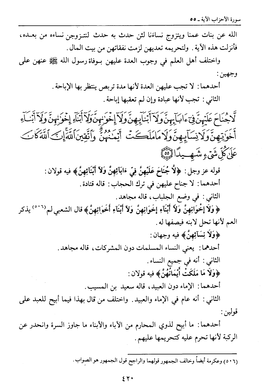 {لا جناح عليهن في آبائهن ولا أبنائهن ولا إخوانهن ولا أبناء إخوانهن ولا أبناء أخواتهن ولا نسائهن ولا ما ملكت أيمانهن واتقين الله إن الله كان على كل شيء شهيدا} قوله عز وجل: {لاَّ جُنَاحَ عَلَيْهِنَّ فِّيءَابَآئِهِنَّ وَلآ أَبْنَآئِهِنَّ} فيه قولان: أحدهما: لا جناح عليهن في ترك الحجاب. قاله قتادة. الثاني: في وضع الجلباب , قاله مجاهد. {وَلاَ إخْوَانِهِنَّ وَلآَ أَبْنَآءِ إخَوَانِهِنَّ وَلآ أَبْنَآءِ أَخَوَاتِهِنَّ} قال الشعبي لم يذكر العم لأنها تحل لابنه فيصفها له. {وَلاَ نِسَآئِهِنَّ} فيه وجهان: أحدهما: يعني النساء المسلمات دون المشركات , قاله مجاهد. الثاني: أنه في جميع النساء. {وَلاَ مَا مَلََكَتْ أَيْمَانُهُنَّ} فيه قولان: أحدهما: الإماء دون العبيد، قاله سعيد بن المسيب. الثاني: أنه عام في الإماء والعبيد. واختلف من قال بهذا فيما أبيح للعبد على قولين: أحدهما: ما أبيح لذوي المحارم من الآباء والأبناء ما جاوز السرة وانحدر عن الركبة لأنها تحرم عليه كتحريمها عليهم.