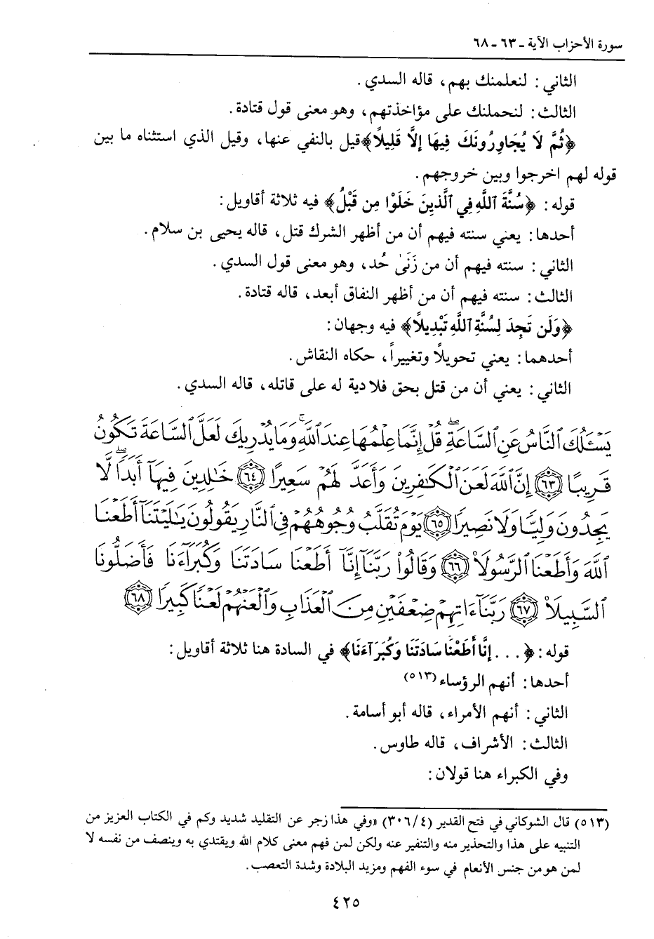 {يسألك الناس عن الساعة قل إنما علمها عند الله وما يدريك لعل الساعة تكون قريبا إن الله لعن الكافرين وأعد لهم سعيرا خالدين فيها أبدا لا يجدون وليا ولا نصيرا يوم تقلب وجوههم في النار يقولون يا ليتنا أطعنا الله وأطعنا الرسولا وقالوا ربنا إنا أطعنا سادتنا وكبراءنا فأضلونا السبيلا ربنا آتهم ضعفين من العذاب والعنهم لعنا كبيرا} قوله: { ... إنَّا أَطَعْنَا سَادَتَنَا وَكُبَرآءَنَا} في السادة هنا ثلاثة أقاويل: أحدها: أنهم الرؤساء. الثاني: أنهم الأمراء , قاله أبو أسامة. الثالث: الأشراف , قاله طاوس. وفي الكبراء هنا قولان: