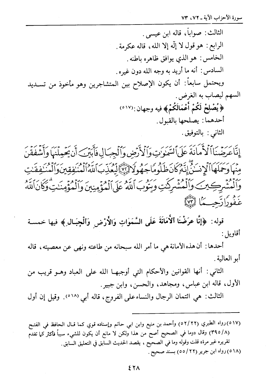 {إنا عرضنا الأمانة على السماوات والأرض والجبال فأبين أن يحملنها وأشفقن منها وحملها الإنسان إنه كان ظلوما جهولا ليعذب الله المنافقين والمنافقات والمشركين والمشركات ويتوب الله على المؤمنين والمؤمنات وكان الله غفورا رحيما} قوله: {إنَّا عرَضْنَا الأمَانَةَ عَلَى السَّمَواتِ وَالأَرْضِ وَالِجبَالِ} فيها خمسة أقاويل: أحدها: أن هذه الأمانة هي ما أمر الله سبحانه من طاعته ونهى عن معصيته , قاله أبو العالية. الثاني: أنها القوانين والأحكام التي أوجبها الله على العباد وهو قريب من الأول , قاله ابن عباس , ومجاهد , والحسن , وابن جبير. الثالث: هي ائتمان الرجال والنساء على الفروج، قاله أبي. وقيل إن أول