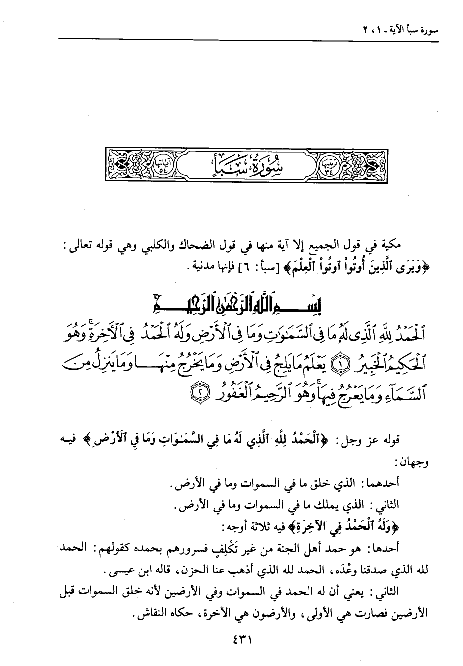 {الحمد لله الذي له ما في السماوات وما في الأرض وله الحمد في الآخرة وهو الحكيم الخبير يعلم ما يلج في الأرض وما يخرج منها وما ينزل من السماء وما يعرج فيها وهو الرحيم الغفور} قوله عز وجل: {الْحَمْدُ لِلَّهِ الَّذِي لَهُ مَا فِي السَّموَاتِ وَمَا فِي الأرْضِ} فيه وجهان: أحدهما: الذي خلق ما في السموات وما في الأرض. الثاني: الذي يملك ما في السموات وما في الأرض. {ولَهُ الْحَمْدُ فِي الآخرَةِ} فيه ثلاثة أوجه: أحدها: هو حمد أهل الجنة من غير تَكْلِفٍ فسرورهم بحمده كقولهم: الحمد لله الذي صدقنا وعْدَه، الحمد لله الذي أذهب عنا الحزن , قاله ابن عيسى. الثاني: يعني أن له الحمد في السموات وفي الأرضين لأنه خلق السموات قبل الأرضين فصارت هي الأولى , والأرضون هي الآخرة، حكاه النقاش.