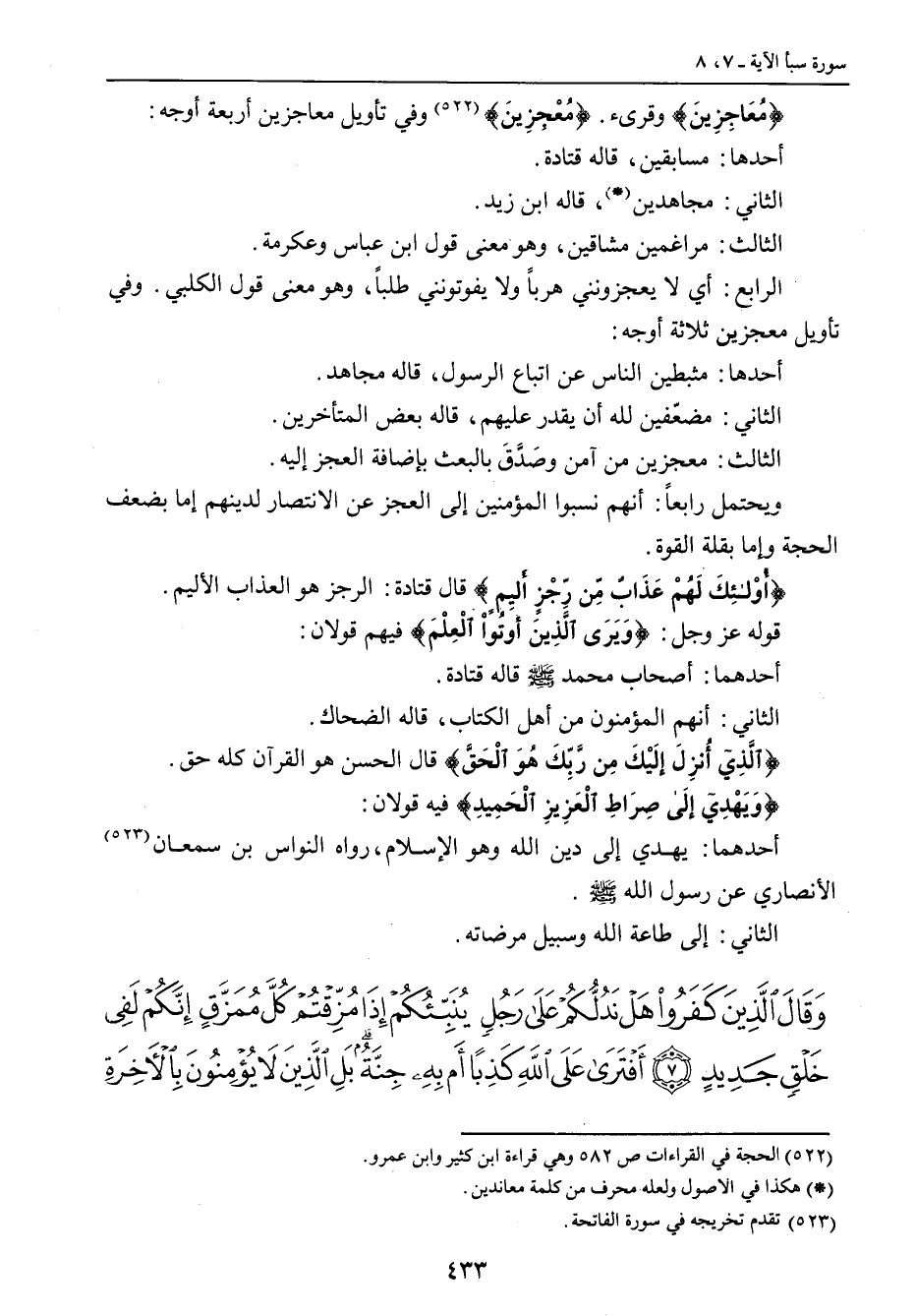 {مُعَاِجِزِينَ} وقرىء. {مُعْجِزِينَ} وفي تأويل معاجزين أربعة أوجه: أحدها: مسابقين , قاله قتادة. الثاني: مجاهدين , قاله ابن زيد. الثالث: مراغمين مشاقين , وهو معنى قول ابن عباس وعكرمة. الرابع: أي لا يعجزونني هرباً ولا يفوتونني طلباً , وهو معنى قول الكلبي. وفي تأويل معجزين ثلاثة أوجه: أحدها: مثبطين الناس عن اتباع الرسول , قاله مجاهد. الثاني: مضعّفين لله أن يقدر عليهم , قاله بعض المتأخرين. الثالث: معجزين من آمن وصَدَّقَ بالبعث بإضافة العجز إليه. ويحتمل رابعاً: أنهم نسبوا المؤمنين إلى العجز عن الانتصار لدينهم إما بضعف الحجة وإما بقلة القوة. {أُوْلئِكَ لَهُمْ عَذَابٌ مِّن رِّجْزٍ أَلِيمٍ} قال قتادة: الرجز هو العذاب الأليم. قوله عز وجل: {وَيَرَى الَّذينَ أوتُواْ الْعِلْمَ} فيهم قولان: أحدهما: أصحاب محمد صلى الله عليه وسلم. الثاني: أنهم المؤمنون من أهل الكتاب , قاله الضحاك. {الَّذِي أُنزِلَ إِلَيْكَ مِن رَّبِّكَ هُوَ الْحَقَّ} قال الحسن هو القرآن كله حق. {وَيَهْدِي إِلَى صِرَاطِ الْعَزِيزِ الْحَمِيدِ} فيه قولان: أحدهما: يهدي إلى دين الله وهو الإسلام , رواه النواس بن سمعان الأنصاري عن رسول الله صلى الله عليه وسلم. الثاني: إلى طاعة الله وسبيل مرضاته.
