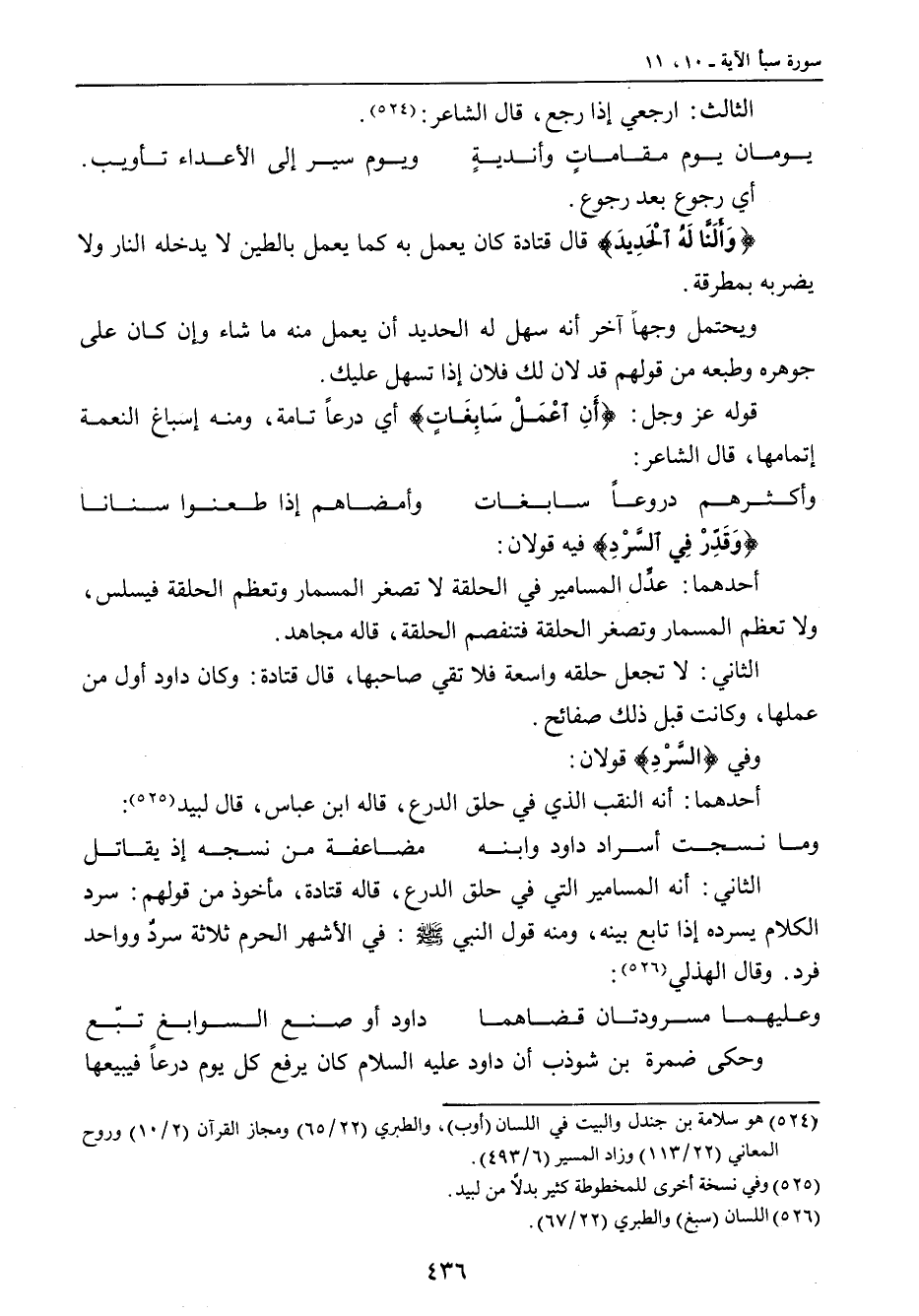 أي رجوع بعد رجوع. {وَأَلَنَّا لَهُ الْحَدِيدَ} قال قتادة كان يعمل به كما يعمل بالطين لا يدخله النار ولا يضربه بمطرقة. ويحتمل وجهاً آخر أنه سهل له الحديد أن يعمل منه ما شاء وإن كان على جوهره وطبعه من قولهم قد لان لك فلان إذا تسهل عليك. قوله عز وجل: {أَنِ اعْمَلْ سَابِغَاتٍ} أي درعاً تامة , ومنه إسباغ النعمة إتمامها , قال الشاعر: