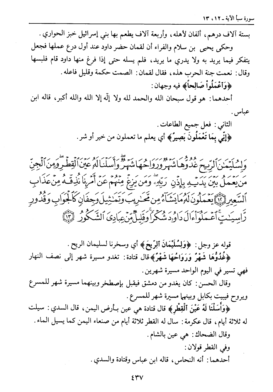 {ولسليمان الريح غدوها شهر ورواحها شهر وأسلنا له عين القطر ومن الجن من يعمل بين يديه بإذن ربه ومن يزغ منهم عن أمرنا نذقه من عذاب السعير يعملون له ما يشاء من محاريب وتماثيل وجفان كالجواب وقدور راسيات اعملوا آل داود شكرا وقليل من عبادي الشكور} قوله عز وجل: {وَلِسُلَيْمَانَ الرِّيحَ} أي وسخرنا لسليمان الريح. {غُدُوَّهَا شَهْرٌ وَرَوَاحُهَا شَهْرٌ} قال قتادة: تغدو مسيرة شهر إلى نصف النهار فهي تسير في اليوم الواحد مسيرة شهرين. وقال الحسن: كان يغدو من دمشق فيقبل بإصطخر وبينهما مسيرة شهر للمسرع ويروح فيبيت بكابل وبينهما مسيرة شهر للمسرع. {وَأَسَلْنَا لَهُ عَيْنَ الْقِطْرِ} قال قتادة هي عين بأرض اليمن , قال السدي: سيلت له ثلاثة أيام , قال عكرمة: سال له القطر ثلاثة أيام من صنعاء اليمن كما يسيل الماء. وقال الضحاك: هي عين بالشام. وفي القطر قولان: أحدهما: أنه النحاس , قاله ابن عباس وقتادة والسدي.
