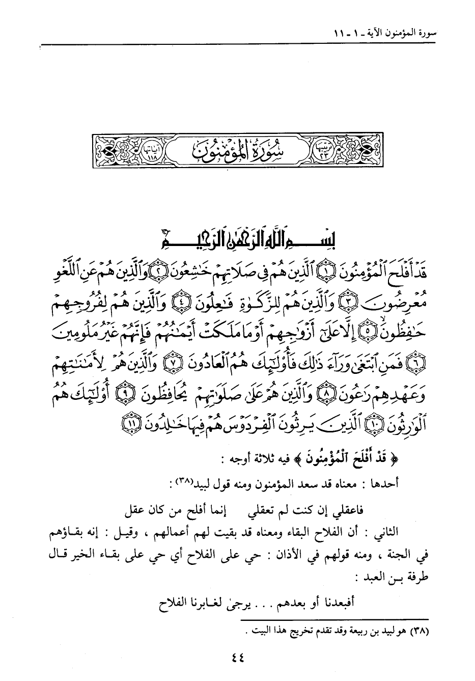 {قد أفلح المؤمنون الذين هم في صلاتهم خاشعون والذين هم عن اللغو معرضون والذين هم للزكاة فاعلون والذين هم لفروجهم حافظون إلا على أزواجهم أو ما ملكت أيمانهم فإنهم غير ملومين فمن ابتغى وراء ذلك فأولئك هم العادون والذين هم لأماناتهم وعهدهم راعون والذين هم على صلواتهم يحافظون أولئك هم الوارثون الذين يرثون الفردوس هم فيها خالدون} {قَدْ أَفْلَحَ الْمُؤْمِنُونَ} فيه ثلاثة أوجه: أحدها: معناه قد سعد المؤمنون ومنه قول لبيد: