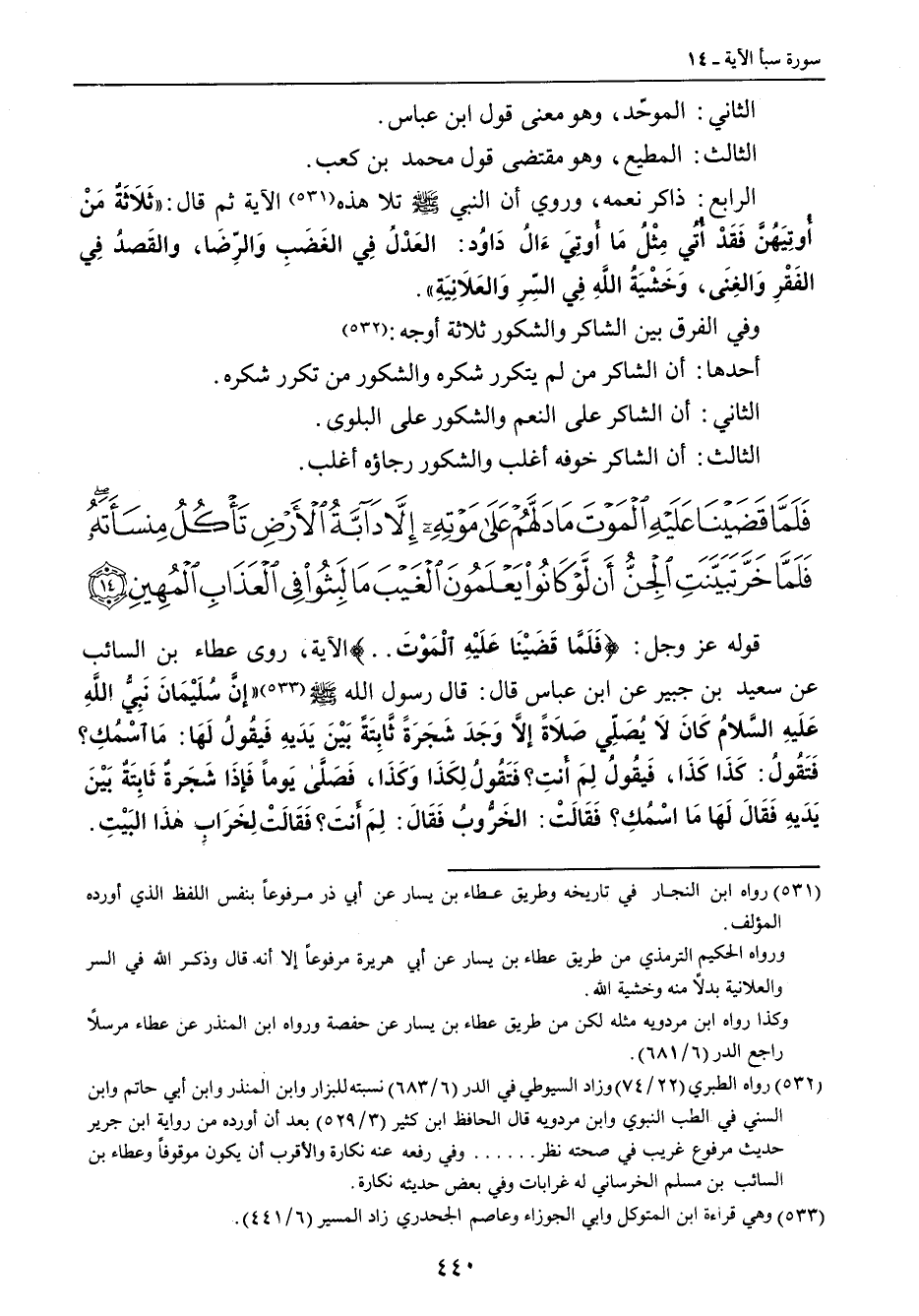 {فلما قضينا عليه الموت ما دلهم على موته إلا دابة الأرض تأكل منسأته فلما خر تبينت الجن أن لو كانوا يعلمون الغيب ما لبثوا في العذاب المهين} قوله عز وجل: {فََلَمَّا قَضَيْنَا عَلَيْهِ الْمَوْتَ. .} الآية. روى عطاء بن السائب. عن سعيد بن جبير عن ابن عباس قال: قال رسول الله صلى الله عليه وسلم: (إنَّ سُلَيْمَانَ نَبِيُّ اللَّهِ عَلَيهِ السَّلاَمُ كَانَ لاَ يُصَلِّي صَلاَةً إلاَّ وَجَدَ شََجَرَةً ثَّابِتَةً بَيْنَ يَدَيهِ فَيقُولُ لَهَا: مَا اسْمُكِ؟ فَتَقُولُ: كَذَا كَذَا , فَيقُولُ لَمَا أَنتِ؟ فَتَقُولُ لِكَذَا وَكَذَا , فَصَلَّى يَوماً فَإِذَا شَجَرةٌ ثَابِتَةٌ بَيْنَ يَدَيهِ فَقَالَ لَهَا مَا اسْمُكِ؟ فَقَالَتْ: الخَرُّوبُ فَقَالَ: لِمَ أَنتَ؟ فَقَالَتْ لِخَرَابِ هذَا البَيْتِ.