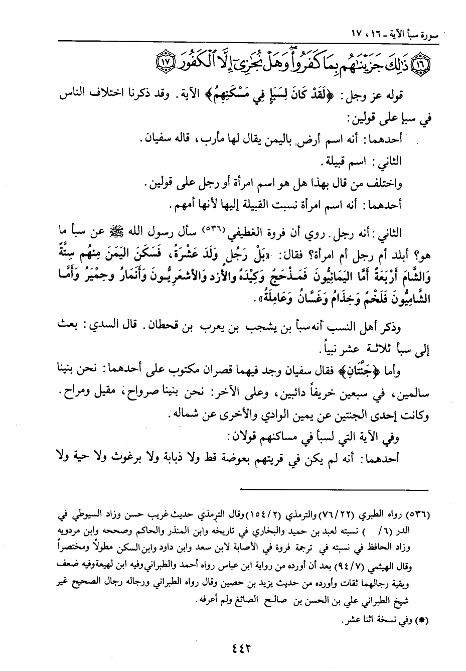 ذلك جزيناهم بما كفروا وهل نجازي إلا الكفور} قوله عز وجل: {لَقَدْ كَانَ لِسَبَإِ فِي مَسْكَنِهِمْ} الآية. وقد ذكرنا اختلاف الناس في سبإ على قولين: أحدهما: أنه اسم أرض باليمن يقال لها مأرب , قاله سفيان. الثاني: اسم قبيلة. واختلف من قال بهذا هل هو اسم امرأة أو رجل على قولين. أحدهما: أنه اسم امرأة نسبت القبيلة إليها لأنها أمهم. الثاني: أنه رجل. روي أن فروة الغطيفي سأل رسول الله صلى الله عليه وسلم عن سبأ ما هو؟ أبلد أم رجل أم امرأة؟ فقال: (بَلْ رَجُلٍ وَلَدَ عَشْرَةً , فَسَكَنَ اليَمَنَ مِنهُم سِتَّةٌ وَالشَّامَ أَرْبَعَةٌ أَمَّا اليَمَانِيُّونَ فَمَذْحَجٌ وَكِيْدَهٌ وَالأزد وَالأَشعَرِيُّونَ وَأَنَمَارُ وحِمْيَرُ وَأَمَّا الشَّامِيُّونَ فَلَخْمٌ وَخِذَامُ وَغَسَّانُ وَعَامِلَةُ). وذكر أهل النسب أنه سبأ بن يشجب بن يعرب بن قحطان. قال السدي: بعث إلى سبأ ثلاثة عشر نبياً. وأما {جَنَّتَانِ} فقال سفيان وجد فيهما قصران مكتوب على أحدهما: نحن بنينا سالمين , في سبعين خريفاً دائبين , وعلى الآخر: نحن بنينا صرواح , مقيل ومراح , وكانت إحدى الجنتين عن يمين الوادي والأخرى عن شماله. وفي الآية التي لسبأ في مساكنهم قولان: أحدهما: أنه لم يكن في قريتهم بعوضة قط ولا ذبابة ولا برغوث ولا حية ولا