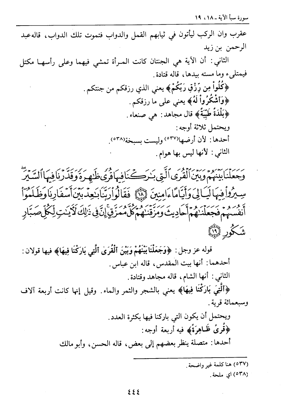 {وجعلنا بينهم وبين القرى التي باركنا فيها قرى ظاهرة وقدرنا فيها السير سيروا فيها ليالي وأياما آمنين فقالوا ربنا باعد بين أسفارنا وظلموا أنفسهم فجعلناهم أحاديث ومزقناهم كل ممزق إن في ذلك لآيات لكل صبار شكور} قوله عز وجل: {وَجَعَلْنَا بَيْنَهُمْ وَبَيْنَ الْقُرَى الَّتِي بَارَكْنَا فِيهَا} فيها قولان: أحدهما: أنها بيت المقدس , قاله ابن عباس. الثاني: أنها الشام , قاله مجاهد وقتادة. {الَّتِي بَارَكْنَا فِيهَا} يعني بالشجر والثمر والماء. وقيل إنها كانت أربعة آلاف وسبعمائة قرية. ويحتمل أن يكون التي باركنا فيها بكثرة العدد. {قُرىً ظَاهِرَةً} فيه أربعة أوجه: أحدها: متصلة ينظر بعضهم إلى بعض، قاله الحسن , وأبو مالك.