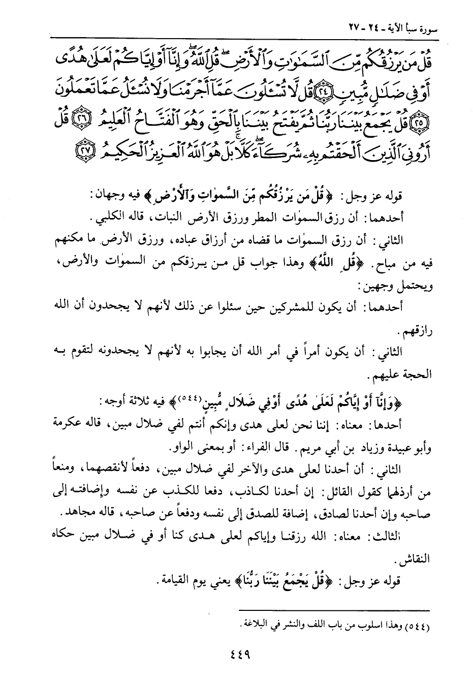 {قل من يرزقكم من السماوات والأرض قل الله وإنا أو إياكم لعلى هدى أو في ضلال مبين قل لا تسألون عما أجرمنا ولا نسأل عما تعملون قل يجمع بيننا ربنا ثم يفتح بيننا بالحق وهو الفتاح العليم قل أروني الذين ألحقتم به شركاء كلا بل هو الله العزيز الحكيم} قوله عز وجل: {قُلْ مَن يَرْزُقُكُم مِّنَ السَّمواتِ وَالأَرْضِ} فيه وجهان: أحدهما: أن رزق السموات المطر ورزق الأرض النبات , قاله الكلبي. الثاني: أن رزق السموات ما قضاه من أرزاق عباده , ورزق الأرض ما مكنهم فيه من مباح. {قُلِ اللَّهُ} وهذا جواب قل من يزرقكم من السموات والأرض , ويحتمل وجهين: أحدهما: أن يكون للمشركين حين سئلوا عن ذلك لأنهم لا يجحدون أن الله رازقهم. الثاني: أن يكون أمراً في أمر الله أي يجابوا به لأنهم لا يجحدونه لتقوم به الحجة عليهم. {وَإِنَّا أَوْ إِيَّاكُمْ لَعَلَى هُدًى أَوْفِي ضَلاَلٍ مُّبِينٍ} فيه ثلاثة أوجه: أحدها: معناه: إننا نحن لعلى هدى وإنكم أنتم لفي ضلال مبين , قاله عكرمة وأبو عبيدة وزياد بن أبي مريم. قال الفراء: أو بمعنى الواو. الثاني: أن أحدنا لعلى هدى والآخر لفي ضلال مبين , دفعاً لأنقصهما , ومنعاً من أرذلهما كقول القائل: إن أحدنا لكاذب , دفعا للكذب عن نفسه وإِضافته إلى صاحبه وإن أحدنا لصادق , إضافة للصدق إلى نفسه ودفعاً عن صاحبه , قاله مجاهد. الثالث: معناه: الله رزقنا وإياكم لعلى هدى كنا أو في ضلال مبين حكاه النقاش. قوله عز وجل: {قُلْ يَجْمَعُ بَيْنَنَا رَبُّنَا} يعني يوم القيامة.