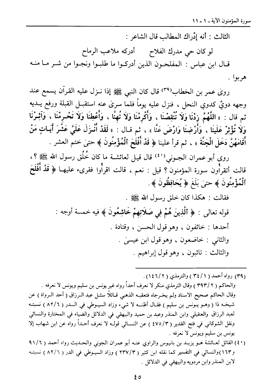 قال ابن عباس: المفلحون الذين أدركوا ما طلبوا ونجوا من شر ما منه هربوا. روى عمر بن الخطاب قال كان النبي صل الله عليه وسلم إذا نزل عليه القرآن يسمع عند وجهه دويٌ كدوي النحل , فنزل عليه يوماً فلما سرى عنه استقبل القبلة ورفع يديه ثم قال: (اللَّهُمَّ زِدْنَا وَلاَ تُنْقِصْنَا , وَأَكْرِمْنَا وَلاَ تُهِنَّا , وَأَعْطِنَا وَلاَ تَحْرِمْنَا , وَآثِرْنَا وَلاَ تُؤْثِرْ عَلَينَا , وَأَرْضِنَا وَارْضَ عَنَّا) ثم قال: (لَقَدْ أَنْزَلَ عَلَيَّ عَشْرَ أَيَاتٍ مَنْ أَقَامَهُنَّ دَخَلَ الْجَنَّةَ) ثم قرأ علينا {قَدْ أَفْلَحَ الْمُؤْمِنُونَ} حتى ختم العشر. روى أبو عمران الجوني قال قيل لعائشة ما كان خُلُق رسول الله صل الله عليه وسلم؟ , قالت أتقرأُون سورة المؤمنون؟ قيل: نعم , قالت اقرأُوا فقرىء عليها {قَدْ أَفْلَحَ الْمُؤْمِنُونَ} حتى بَلَغَ {يَحَافِظُونَ}. فقالت: هكذا كان خلق رسول الله صلى الله عليه وسلم. قوله تعالى: {الَّذِيِنَ هُمْ فِي صَلاَتِهِمْ خَاشِعُونَ} فيه خمسة أوجه: أحدها: خائفون، وهوقول الحسن، وقتادة. والثاني: خاضعون، وهو قول ابن عيسى. والثالث: تائبون، وهو قول إبراهيم.