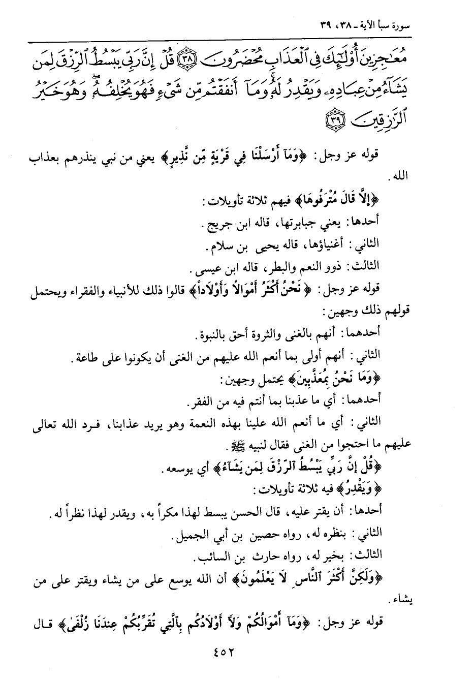 معاجزين أولئك في العذاب محضرون قل إن ربي يبسط الرزق لمن يشاء من عباده ويقدر له وما أنفقتم من شيء فهو يخلفه وهو خير الرازقين} قوله عز وجل: {وَمَآ أَرْسَلْنَا فِي قَرْيَةٍ مِّن نَّذِيرٍ} يعني من نبي ينذرهم بعذاب الله. {إلاَّ قَالَ مُتْرَفُوهَا} فيهم ثلاثة تأويلات: أحدها: يعني جبابرتها , قاله ابن جريج. الثاني: أغنياؤها , قاله يحيى بن سلام. الثالث: ذوو النعم والبطر , قاله ابن عيسى. قوله عز وجل: {نَحْنُ أَكْثَرُ أَمْوَالاً وأَوْلاَداً} قالوا ذلك للأنبياء والفقراء ويحتمل قولهم ذلك وجهين: أحدهما: أنهم بالغنى والثروة أحق بالنبوة. الثاني: أنهم أولى بما أنعم الله عليهم من الغنى أن يكونوا على طاعة. {وَمَا نَحْنُ بِمُعَذَّبِينَ} يحتمل وجهين: أحدهما: أي ما عذبنا بما أنتم فيه من الفقر. الثاني: أي ما أنعم الله علينا بهذه النعمة وهو يريد عذابنا , فرد الله تعالى عليهم ما احتجوا من الغنى فقال لنبيه صلى الله عليه وسلم. {قُلْ إنَّ رَبِّي يُبْسُطُ الرّزْقَ لِمَن يَشَآءُ} أي يوسعه. {وَيَقْدِرُ} فيه ثلاثة تأويلات: أحدها: أن يقترعليه , قال الحسن يبسط لهذا مكراً به , ويقدر لهذا نظراً له. الثاني: بنظره له , رواه حصين بن أبي الجميل. الثالث: بخير له , رواه حارث بن السائب. {وَلَكِنَّ أَكْثَرَ النَّاسِ لاَ يَعْلَمُونَ} أن الله يوسع على من يشاء ويقتر على من يشاء. قوله عز وجل: {وَمَآ أَمْوَالُكُمْ وَلآ أَوْلاَدُكُمْ بالتَّي تُقَرِّبُكُمْ عِندَنَا زُلْفَى} قال